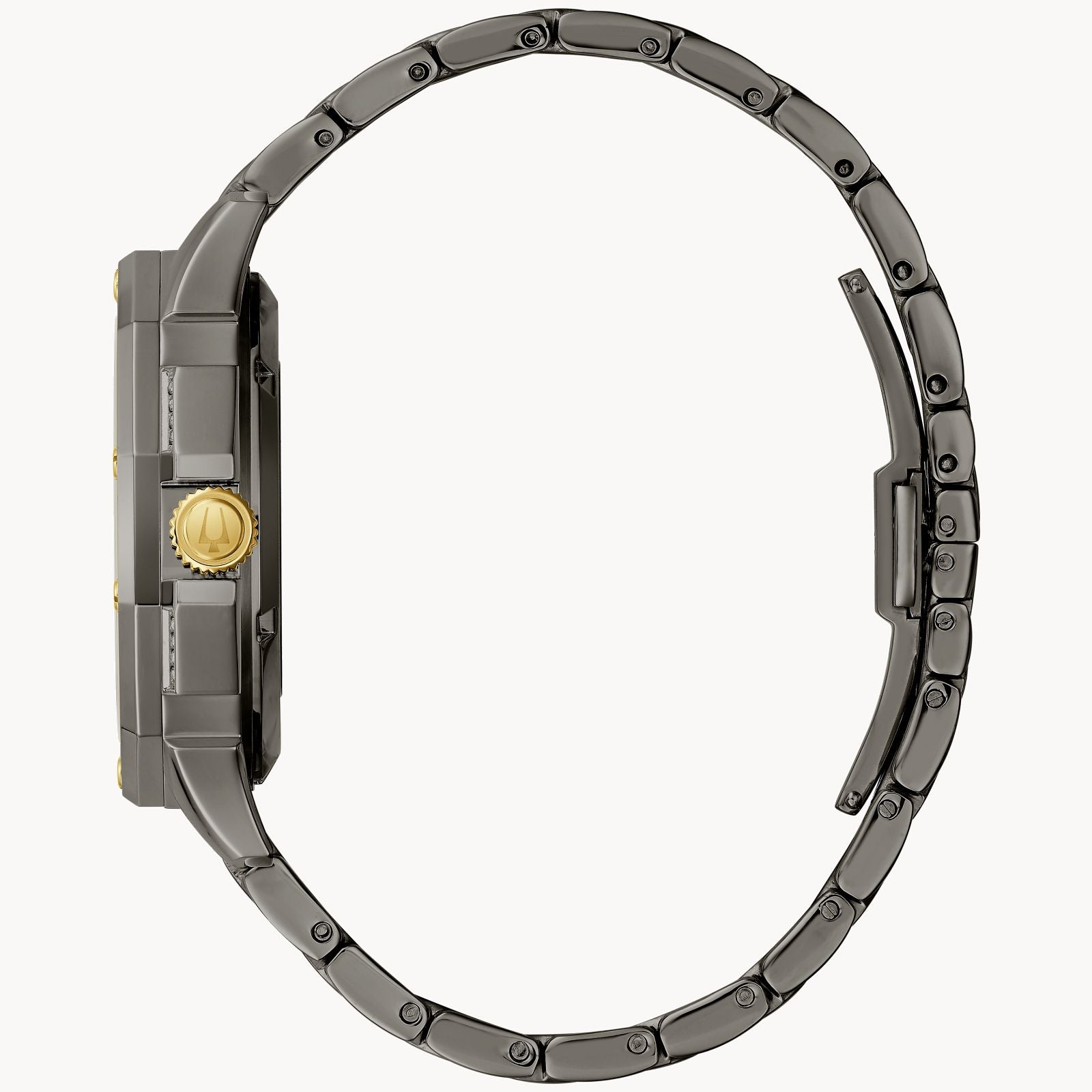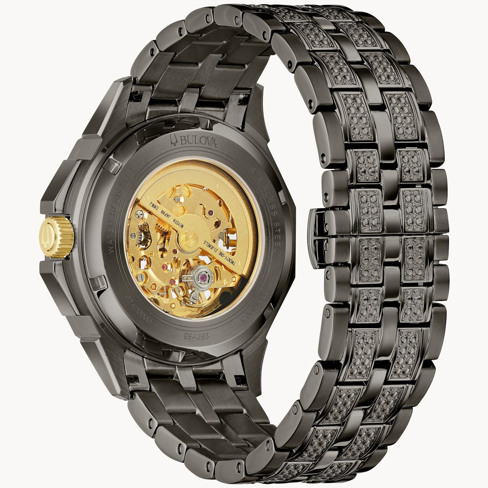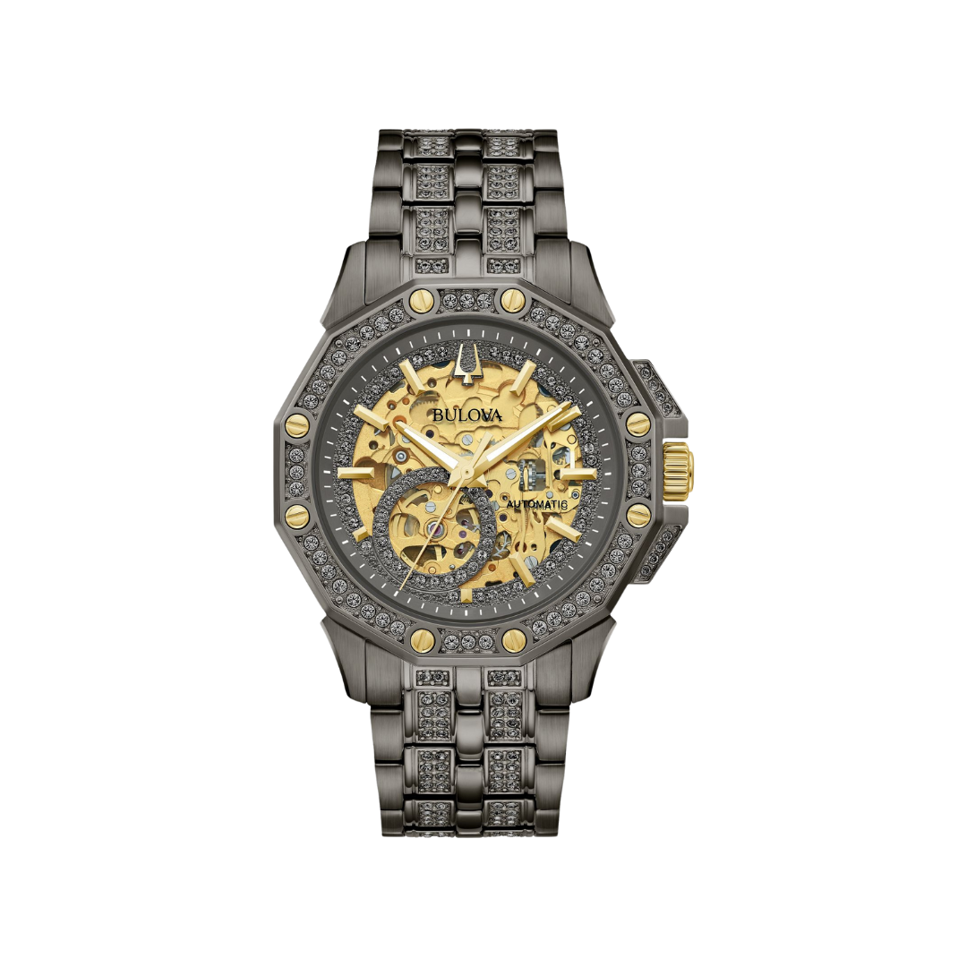 Nouveauté de la collection Crystal pour hommes, cette montre est dotée d'un mouvement automatique 8N26 dans un boîtier et un bracelet en acier inoxydable plaqué ion gris avec boucles déployantes et doubles poussoirs. Il est orné de 251 cristaux sur la lunette, le bracelet et le cadran squelette gris plaqué ion. Résistant à l'eau jusqu'à 30 mètres. Calibre : 8N26