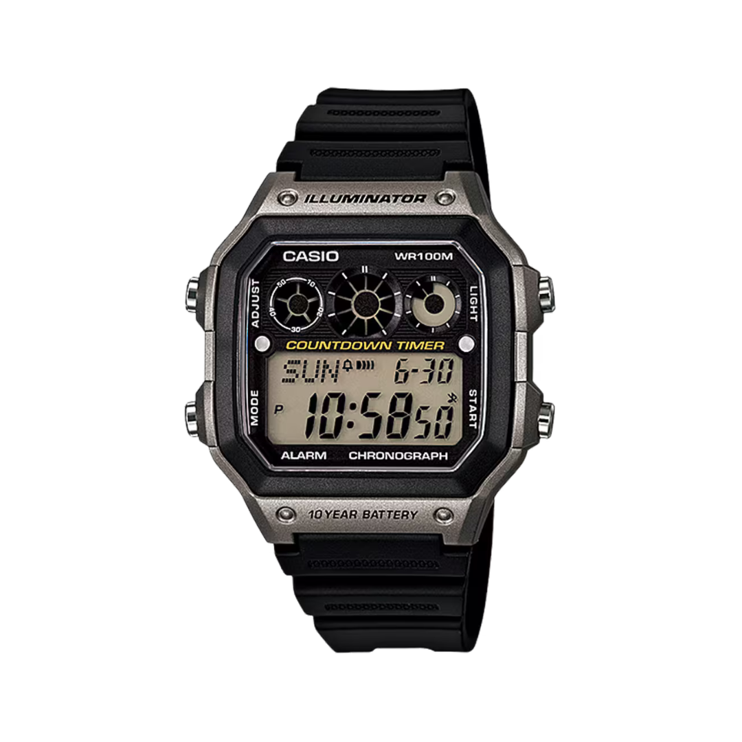 10-YEAR BATTERY LIFE • 100-meter water resistance • LED backlight • Alarm • Interval timer • 9 preset timer