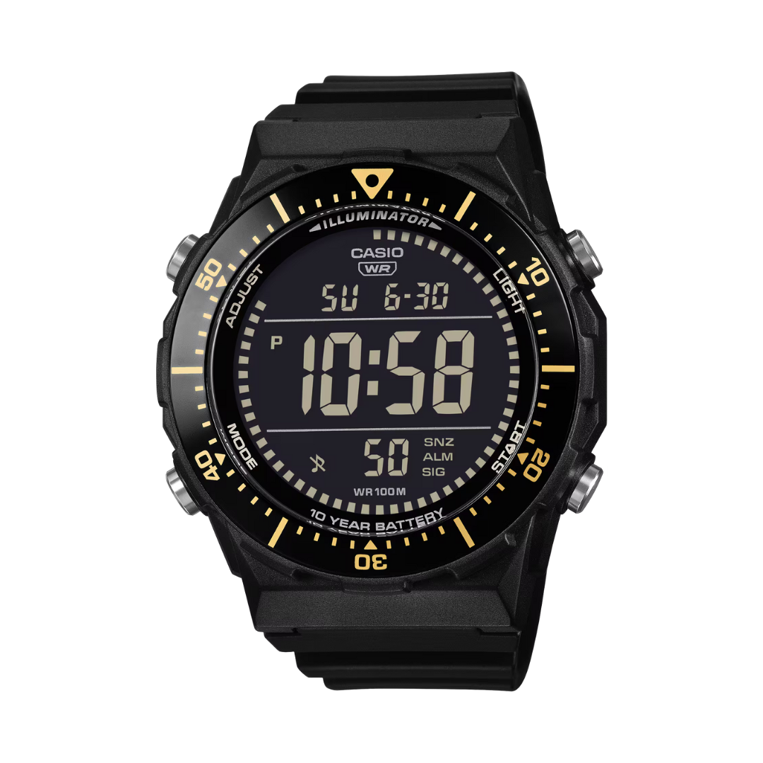 Water-resistant up to 100 meters, ten-year battery life, LED backlight, as well as handy features like stopwatch, alarm, and more.
