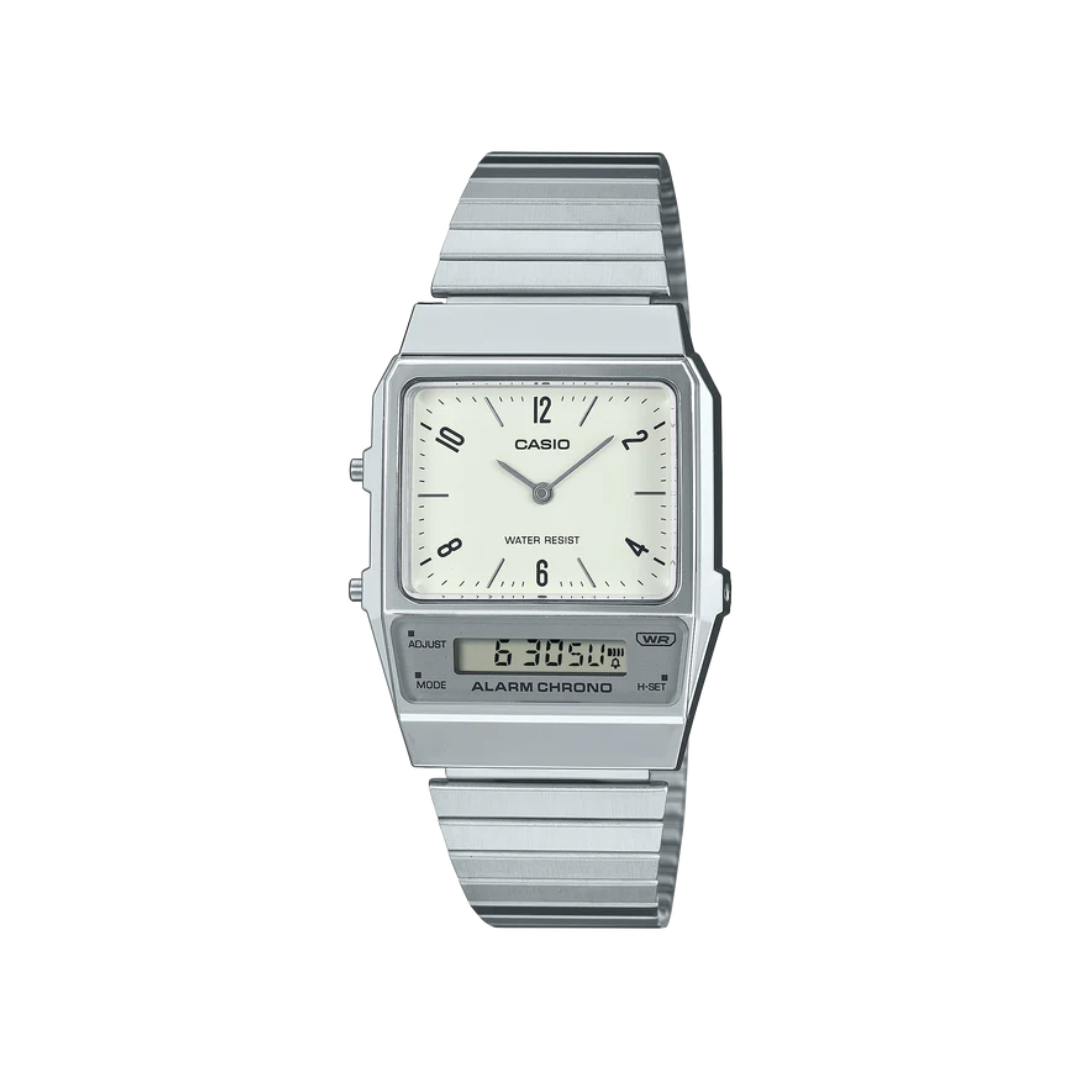 Numeric indexes and a touch of glossy color come together in a traditional, yet up-to-date design. The separate dial and LCD serve up analog beauty alongside digital performance. The oblong watch case contrasts beautifully with the long and slim horizontal links of the metal band for a distinctively stylish look.