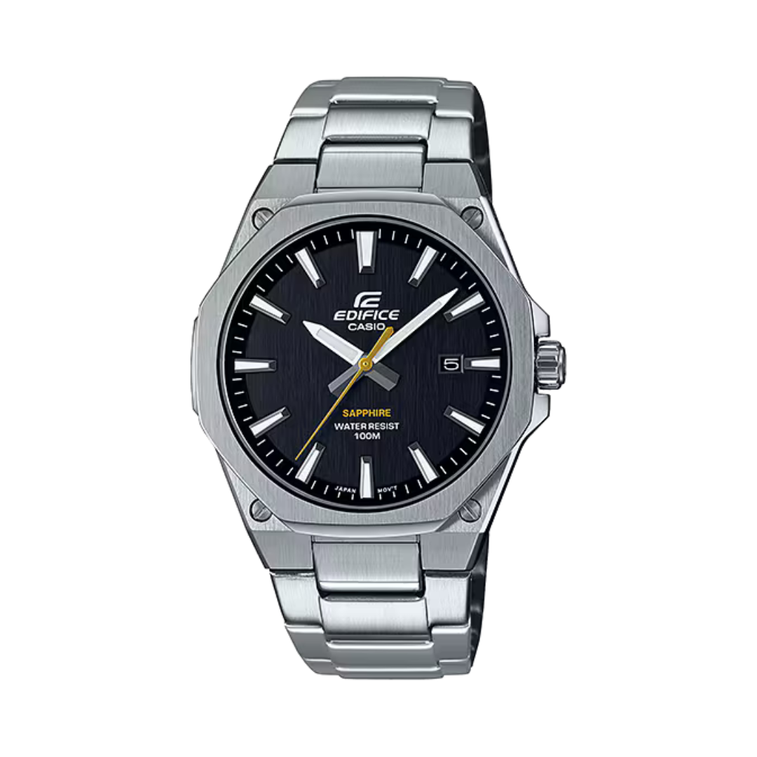 EDIFICE SLIM series with Sapphire Crystal | This three-hand analog model features a slim 7.8 mm thick case that enhances fit. The watch boasts a flat octagonal bezel with a hairline finish that creates a sporty yet luxurious design. A dial with a hairline finish also creates a high quality feel. Screws at the four corners of the case, a powerful index design, and a gold second hand create a sporty finish. Uses a scratch-resistant sapphire crystal.