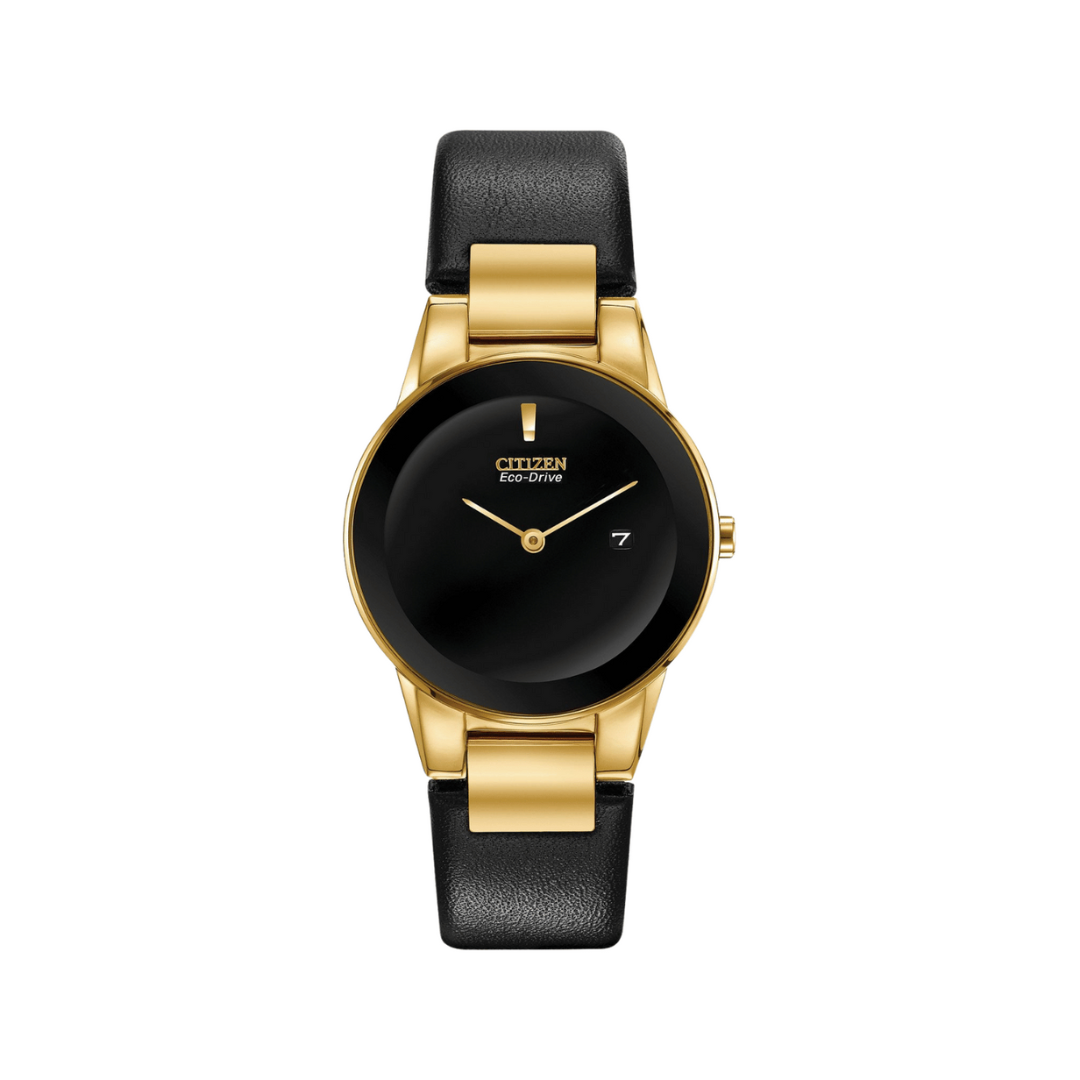 Le design raffiné mais élégant d'Axiom offre une option de mode de jour comme de nuit pour le lanceur de tendances avide. En vedette dans un boîtier en acier inoxydable doré avec un Bracelet en cuir, un cadran noir, et la caractéristique intrigante du verre bord à bord. Doté de notre technologie Eco-Drive - alimenté par la lumière, n'importe quelle lumière. Jamais besoin d'une batterie.