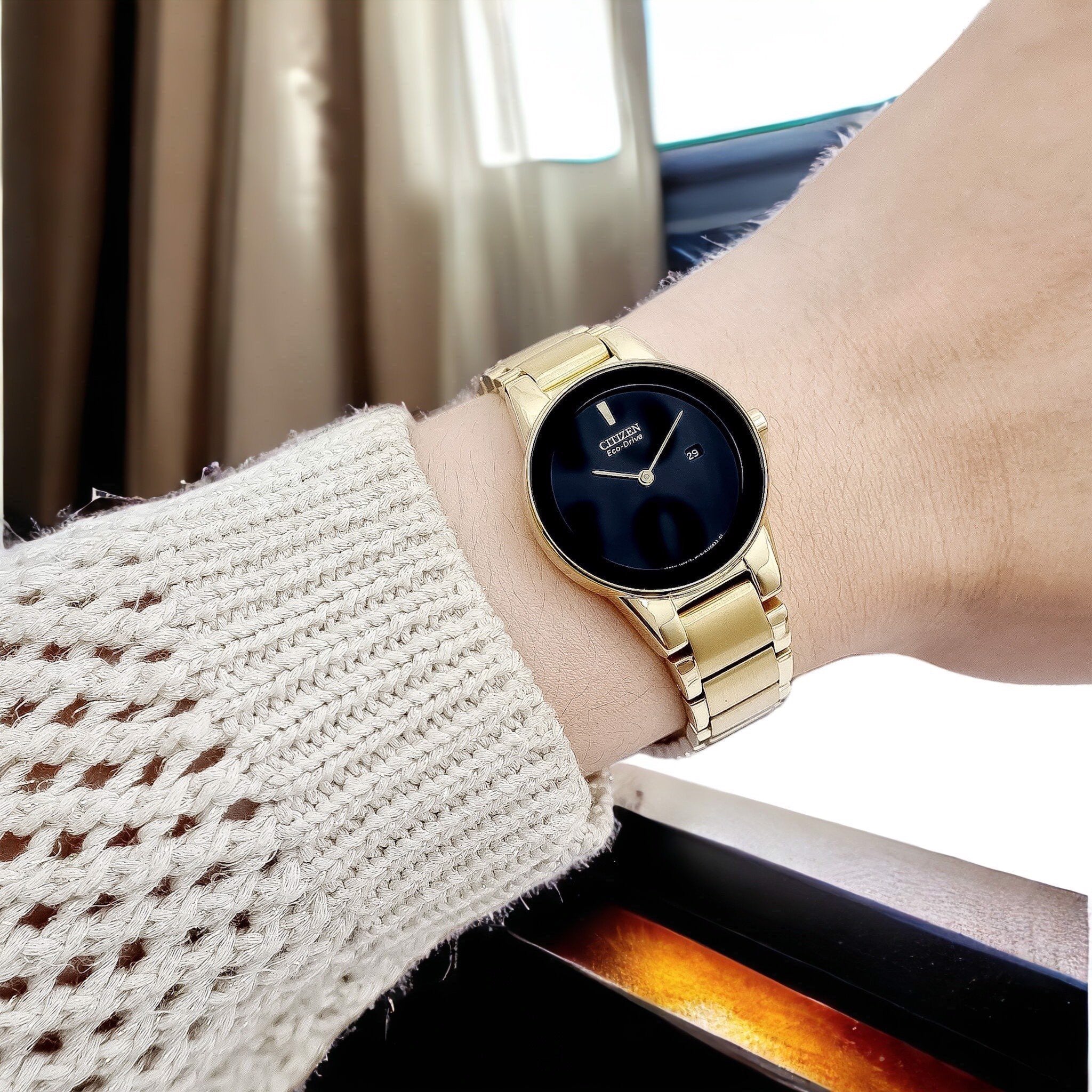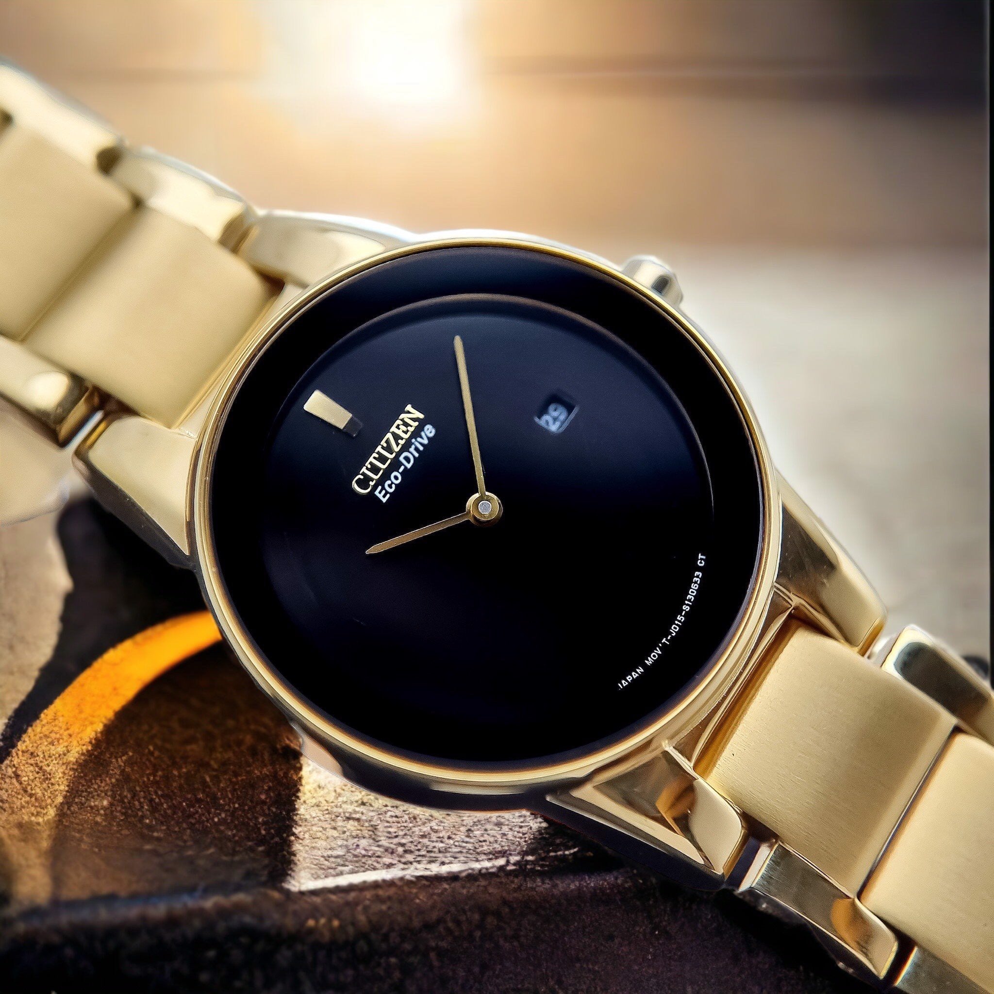 Le design raffiné mais élégant d'Axiom offre une option de mode de jour comme de nuit pour le lanceur de tendances avide. En vedette en acier inoxydable doré avec un cadran noir, Accents d'acier inoxydable d'or-tonalité et la caractéristique intrigante du verre de bord à bord.