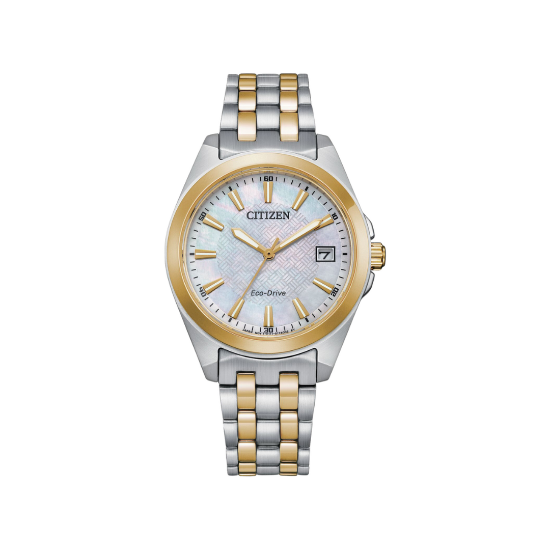 Ce garde-temps classique de CITIZEN est une montre populaire pour femmes qui ne se démodera jamais. Elle est dotée d'une montre bicolore de style bracelet en acier inoxydable Bande, jumelé avec un cadran à trois mains en nacre pour faire une montre qui aura fière allure pour toute occasion. En plus de montrer la date actuelle, la montre est alimentée durablement par la lumière avec la technologie exclusive Eco-Drive de CITIZEN, de sorte que vous n'aurez jamais à vous soucier de l'heure manquante. Pour chaque femme à la recherche d'un garde-temps de tous les jours, cette montre est l'accessoire parfait à ajouter à la garde-robe.