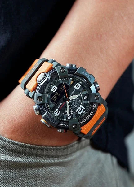De la série MASTER DE G MUDMASTER, la montre qui est conçu et conçu pour résister à des environnements terrestres difficiles, viennent des GGB100-1A de modèle en résine de carbone qui intègrent un nouveau type de structure. L'affaire est faite de matériel de carbone de haut-rigidité pour se protéger contre des dommages et la déformation dus à l'impact et à tout autre traitement approximatif, alors que les pipes de bouton en métal assurent un joint plus serré contre l'environnement externe. Un filtre protège en outre contre l'invasion de boue, pour le haut niveau de résistance de la poussière et de boue exigée quand dans les environnements graves. En outre, la double couverture arrière se compose d'un dos de panneau d'acier inoxydable et d'une couverture externe faite de résine fine résistante aux chocs incluse avec des fibres de verre. La lunette est formée de trois couches de résine fine avec des inserts en fibre de carbone. La couche supérieure est transparente, ce qui donne une lunette qui montre le matériau carbone incorporé. Les capacités Quad Sensor utilisent des capteurs compacts qui permettent d'emballer des mesures de boussole, d'altitude/baromètre et de température, ainsi qu'un accéléromètre qui garde la trace de votre nombre de pas, dans une configuration compacte. Cela fournit à l’aventurier de plein air les moyens de garder une trace de l’environnement environnant lors de ses déplacements. Une application spéciale G-SHOCK, qui simplifie la configuration des paramètres de la montre, comprend également une nouvelle fonction de mission. L’application enregistre automatiquement les données d’altitude mesurées par la montre et les informations d’itinéraire acquises par le GPS d’un smartphone. Les points d’altitude obtenus manuellement peuvent être tracés sur votre itinéraire. La mesure de l’altitude et le nombre de pas sont utilisés pour effectuer des calculs de calories consommées qui tiennent compte des notes ascendantes et descendantes, et pour enregistrer les résultats dans un journal d’activité. Une opération sur le bouton de la montre peut être utilisée pour enregistrer votre position actuelle avec l’application. Ensuite, l’aiguille des secondes indique le relèvement jusqu’à l’emplacement enregistré, tandis que l’affichage numérique indique la distance jusqu’à l’emplacement. Ces nouveaux modèles prennent également en charge la personnalisation de la commutation de mode. Vous pouvez utiliser l’application pour activer ou désactiver des modes individuellement afin que seuls les modes activés apparaissent. Vous pouvez même spécifier la séquence à utiliser lors de l’affichage des modes.