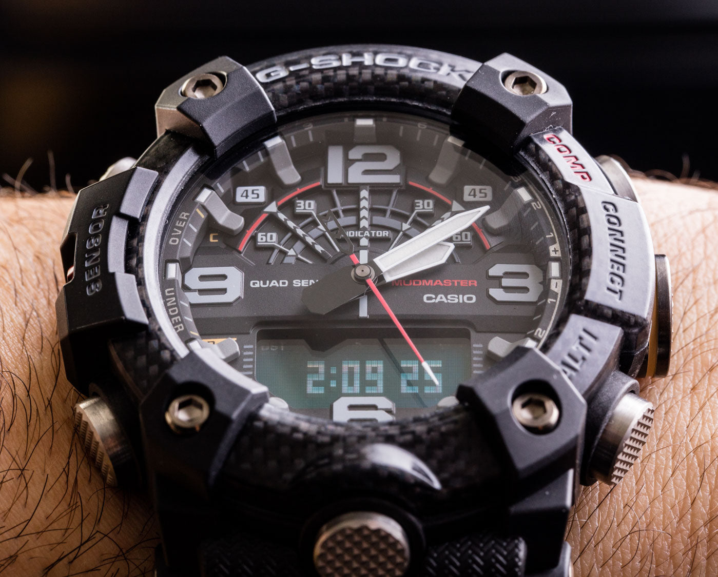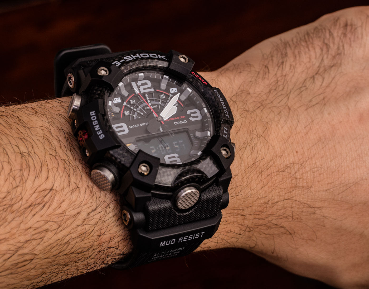De la série MASTER DE G MUDMASTER, la montre qui est conçu et conçu pour résister à des environnements terrestres difficiles, viennent des GGB100-1A de modèle en résine de carbone qui intègrent un nouveau type de structure. L'affaire est faite de matériel de carbone de haut-rigidité pour se protéger contre des dommages et la déformation dus à l'impact et à tout autre traitement approximatif, alors que les pipes de bouton en métal assurent un joint plus serré contre l'environnement externe.