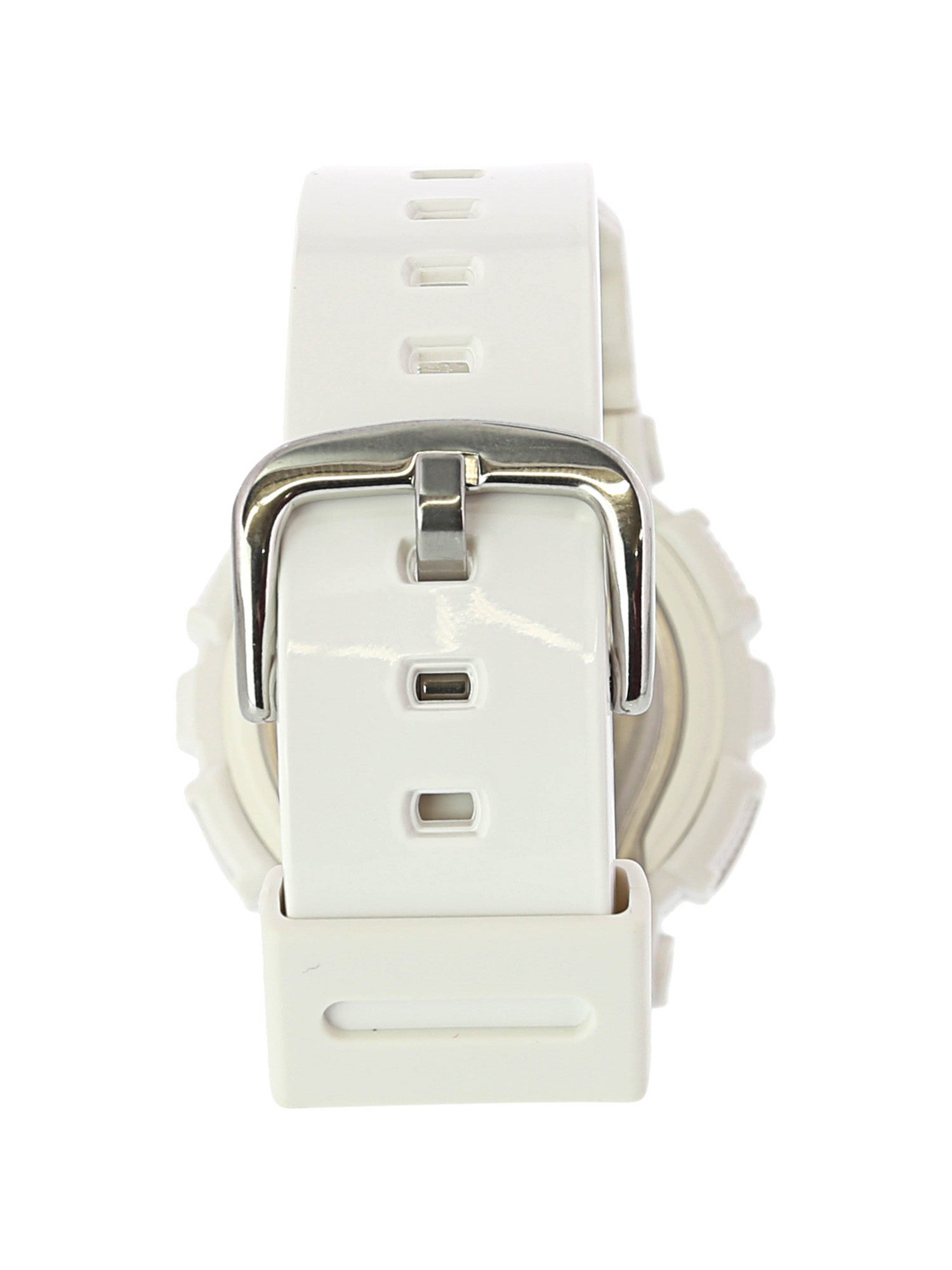 Casio Baby-G grandit avec une nouvelle collection de garde-temps inspirée de son «grand frère» analogique et numériquement dynamite, le XL GA110 G-Shock. Le ou les modèles BA110 sont dotés d'un bracelet en résine léger et brillant dans deux teintes à la mode de noir et blanc mettant en lumière le grand cadran de la montre brossé en or et or rose métallisé. Le BA110 est équipé d'une face métallique 3D en couches, ainsi que d'aiguilles à motif d'engrenages, qui rappellent les éléments de style sophistiqués du design industriel. Les femmes peuvent apporter de la classe au travail avec le blanc/or rose, le blanc/argent, l'argent/argent et l'horloge pour affronter la nuit avec le noir/or. Montre analogique et numérique à bracelet en résine blanche avec cadran rose métallisé.