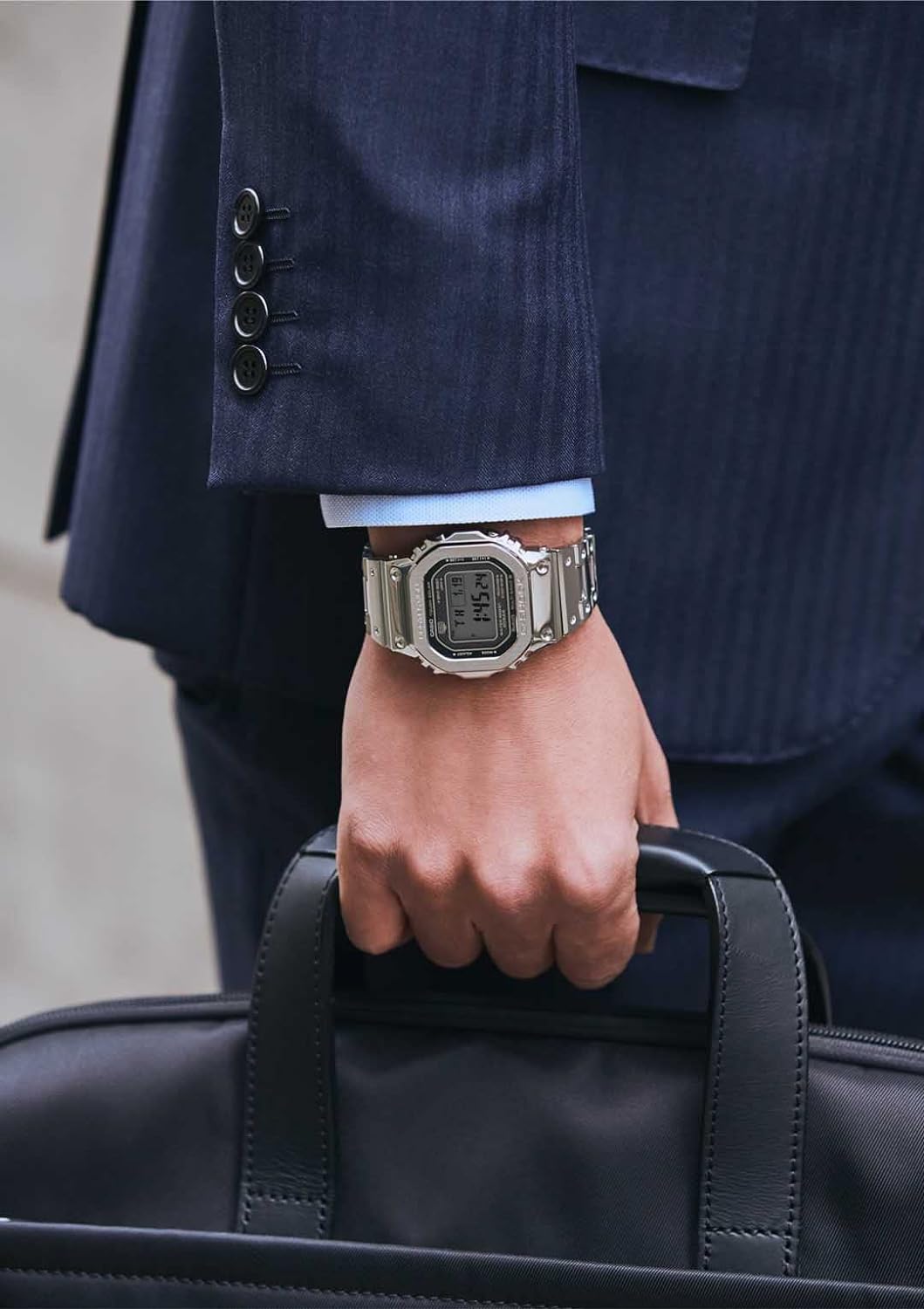 La Full Metal GMWB5000D-1 est une toute nouvelle montre entièrement métallique spécialement conçue. Inspiré du premier modèle G-SHOCK, DW5000C, cet original amélioré présente un coloris moderne et brillant tout en conservant une esthétique vintage. La montre intègre également l'un des premiers et des plus emblématiques modèles de boîtier G-SHOCK, avec un boîtier et une lunette vintage de forme carrée avec un motif de brique sur le cadran. Le GMWB5000D-1 intègre un super éclairage LED et une batterie solaire, ce qui le rend capable de se charger automatiquement, ainsi qu'un écran LCD STN spécial. De plus, la montre intègre un boîtier entièrement en acier inoxydable amélioré et élégant et un boîtier à fond vissé DLC. La synchronisation bidirectionnelle de l'heure est rendue possible via la connectivité Bluetooth et l'application G-SHOCK, ainsi que la technologie de chronométrage atomique multi-bande 6 de G-SHOCK, qui fournit une chronométrage précis pratiquement n'importe où via des signaux radio provenant de jusqu'à six émetteurs différents dans le monde.