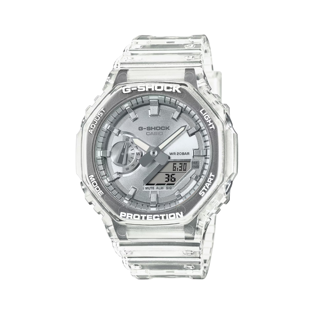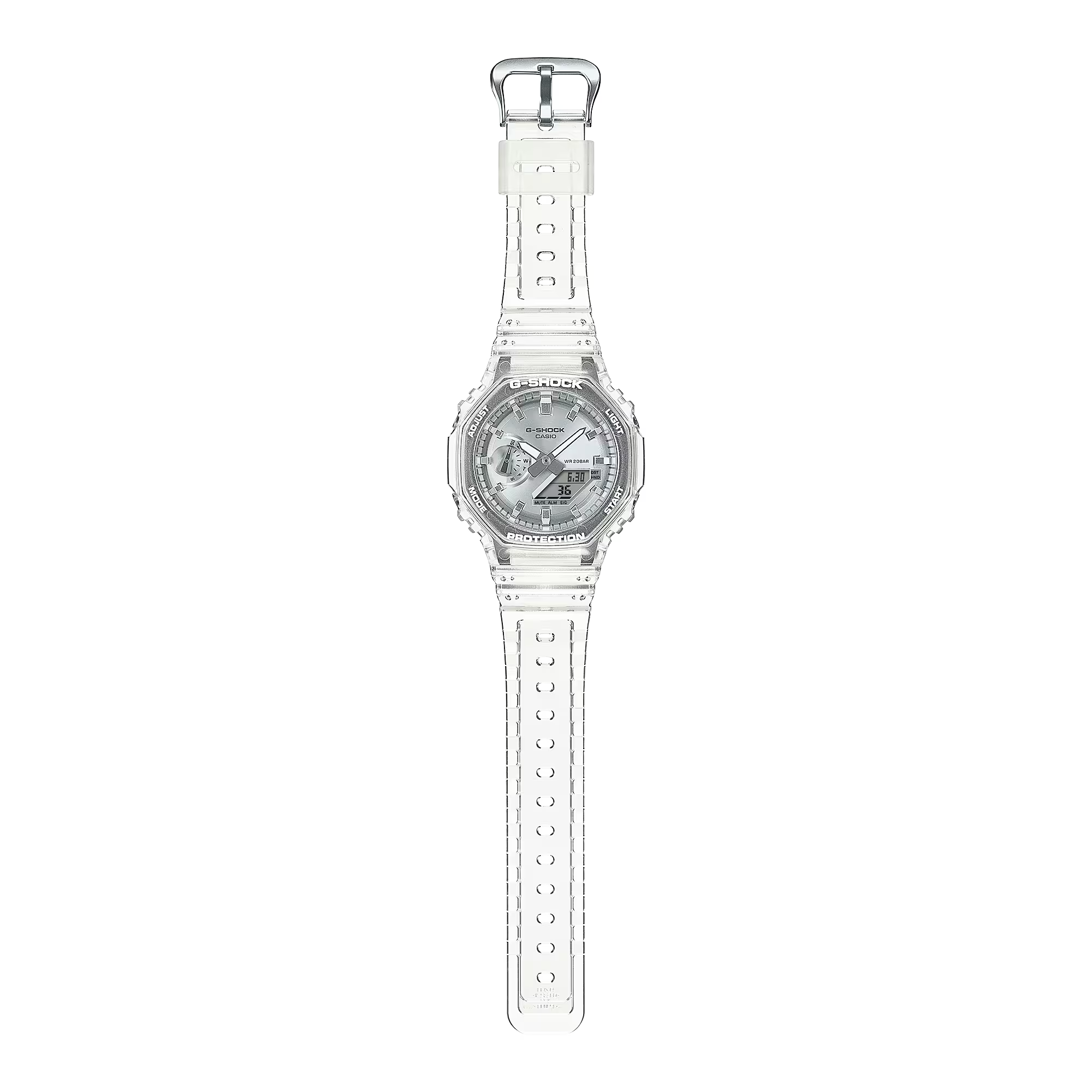 The GA2100 with octagonal bezel is paired with a dial finished in metallic vapor deposition in popular color — silver — offset by a translucent band for a confidently cool look.