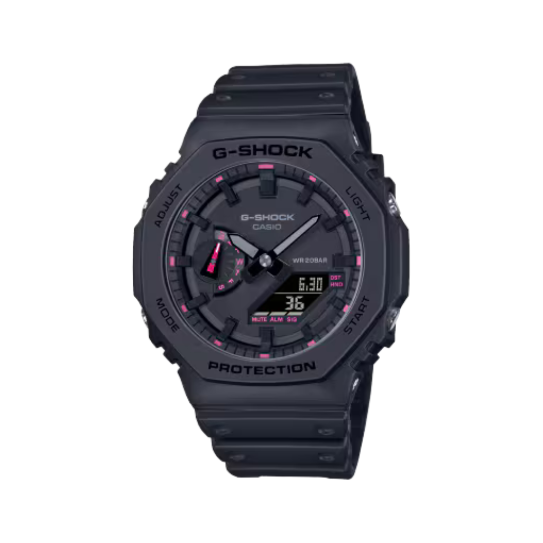 Key Features: Distinctive Design: An evolved avatar of the famed digital analog GA2100 series, including its sleeker sibling, the GMAS2100. Its audacious black base is brilliantly offset by the pink accents, offering a harmonious blend of elegance and boldness.