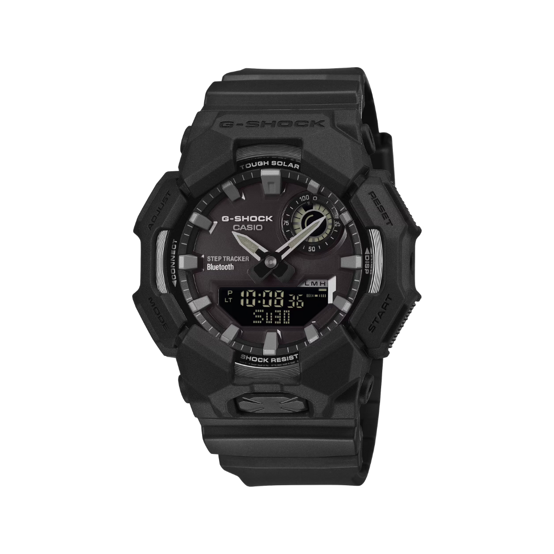 Introducing the solar-power-only watch capable of tracking and digitally displaying steps. The analog-digital combination GA-B010 features a large case with large, easy to read display. Deliciously detailed finishes — with a bezel ring treated to a vapor deposition finish, a sun-ray finish for the dial, and a metallic finish applied to the inset dial — add extra value to the toughness-oriented design.