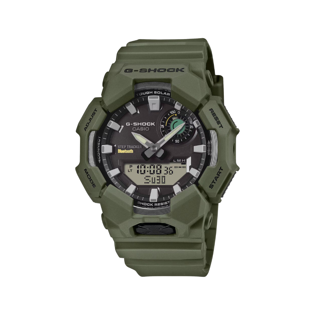 Introducing the solar-power-only watch capable of tracking and digitally displaying steps. The analog-digital combination GA-B010 features a large case with large, easy to read display. Deliciously detailed finishes — with a bezel ring treated to a vapor deposition finish, a sun-ray finish for the dial, and a metallic finish applied to the inset dial — add extra value to the toughness-oriented design.