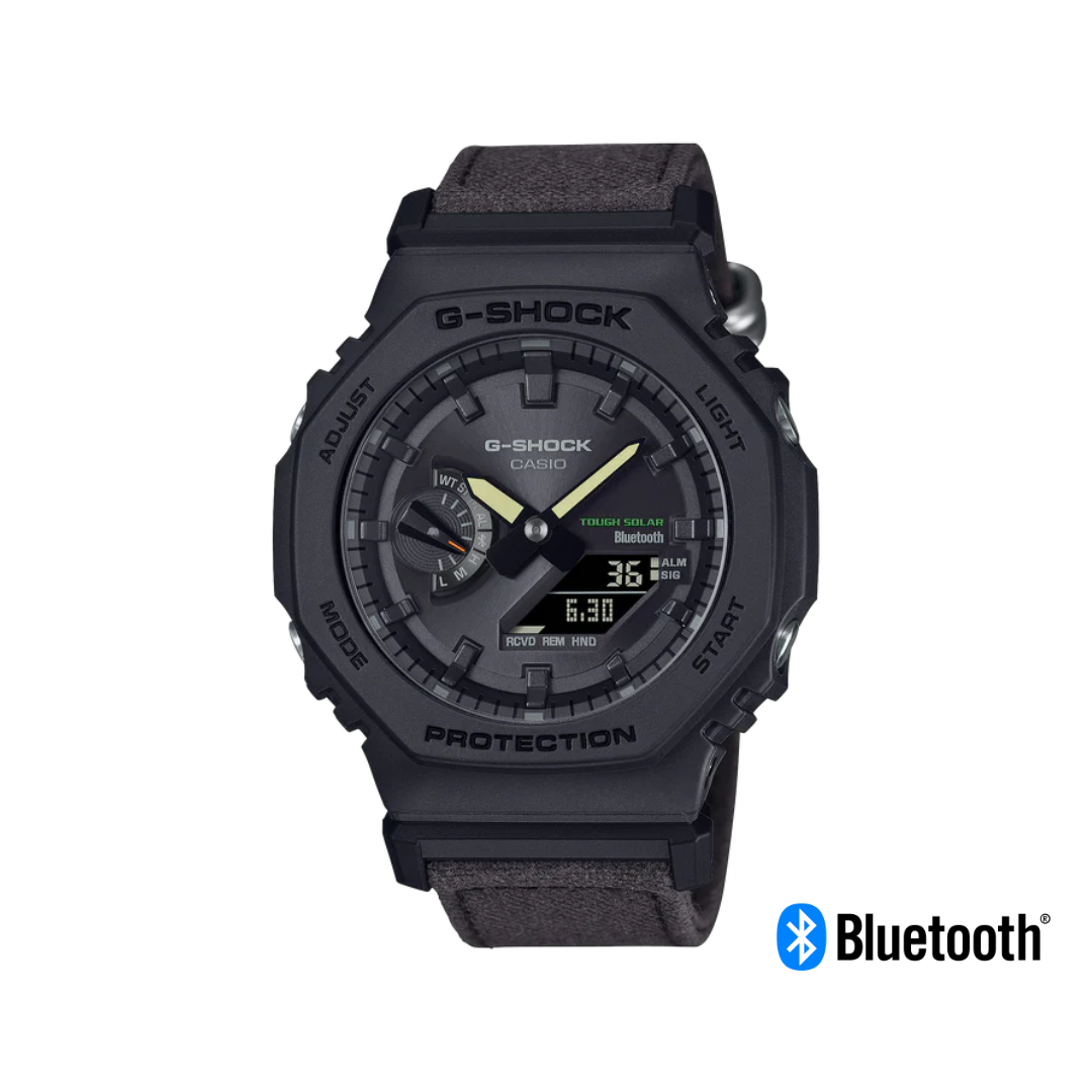 Les bandes sont colorées avec des colorants de FOOD TEXTILE, un projet visant à réutiliser des aliments qui autrement seraient jetés pour créer des colorants naturels. Les couleurs douces et terreuses prennent vie grâce à des teintures composées à plus de 90 % d'ingrédients naturels. La teinte brun foncé du bracelet GA-B2100CT-1A5 est obtenue grâce à un colorant extrait du café, tandis que la couleur gris kaki du bracelet GA-B2100CT-5A provient d'un colorant extrait de l'échinacée.