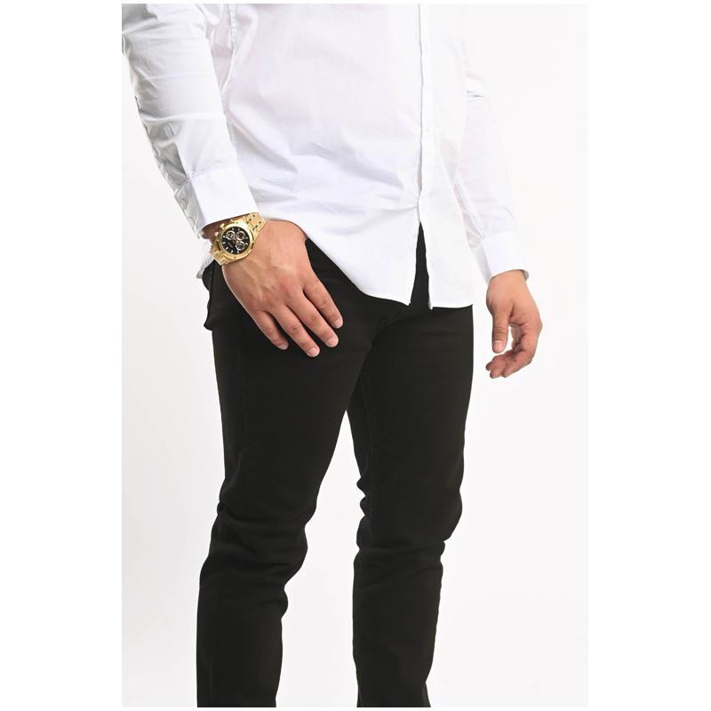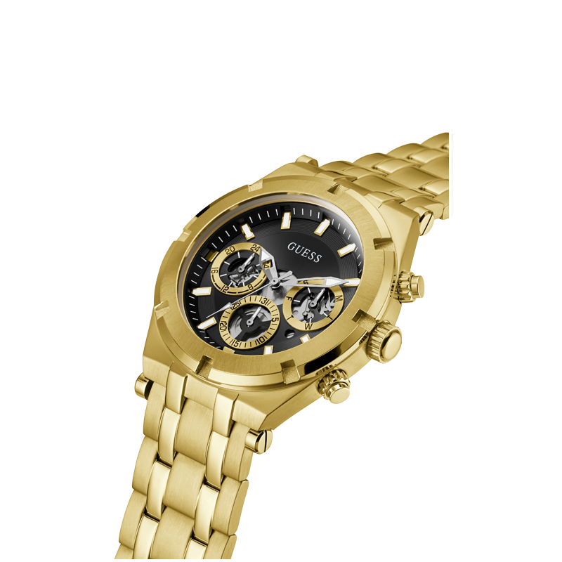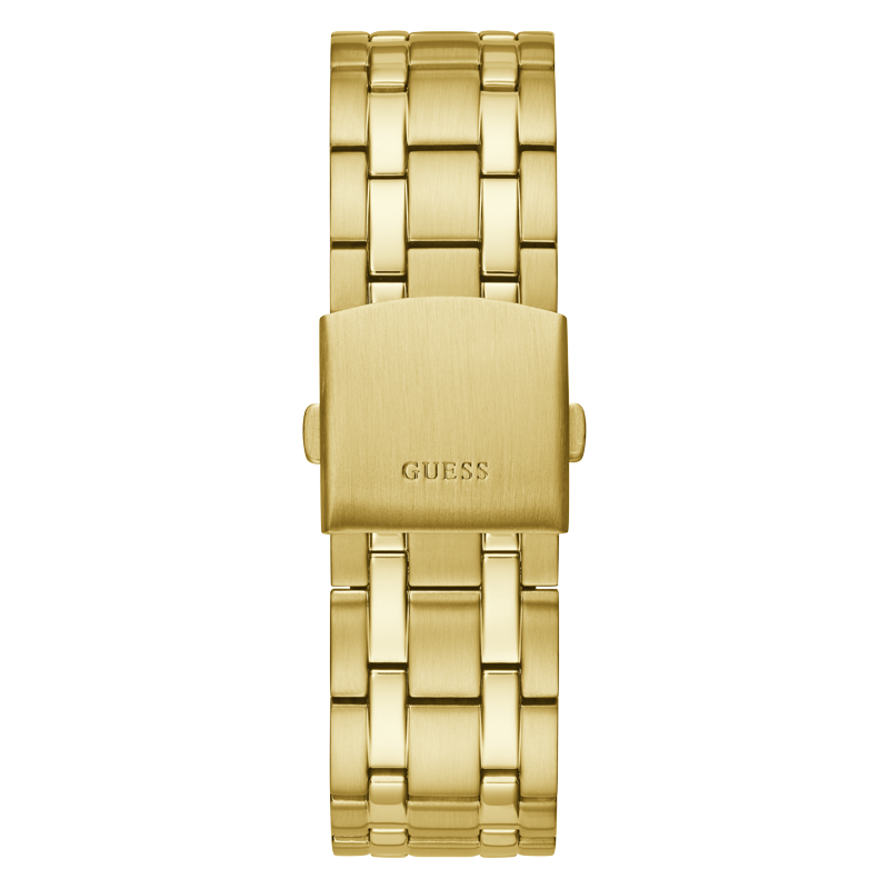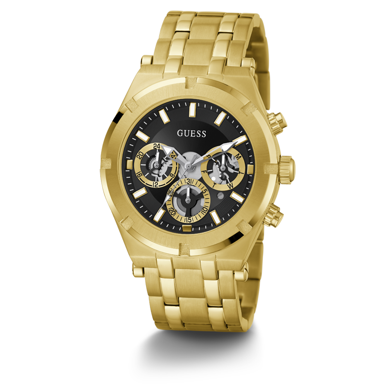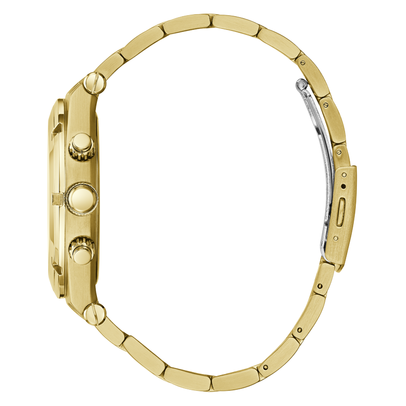 Quotidien, élevé. Cette élégante montre dorée est dotée d'un cadran multifonctionnel moderne avec des marqueurs d'heure minimalistes et des fonctions de jour, de date et d'heure internationale sur 24 heures. Terminé par un bracelet à maillons polis.