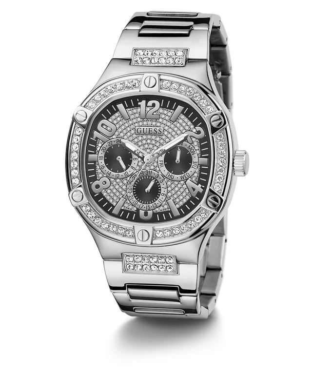 Un look royal digne d'un duc, cette montre surestimée et surestimée est dotée de cristaux et de détails de vis ainsi que d'un design de forme de boîtier unique avec des détails en cristal supplémentaires sur l'élégant bracelet.