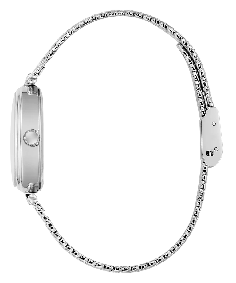 This style features 29 mm x 24 mm oval case in silver tone polished stainless steel paired with a herringbone textured self-adjustable mesh bracelet. The black sunray dial showcases a lab grown diamond at the 12 o'clock hour. Powered by precise quartz analog movement and water resistant up to 30 meters, this pretty new design is perfect for the woman who appreciates authentic luxury details and timeless sophistication.