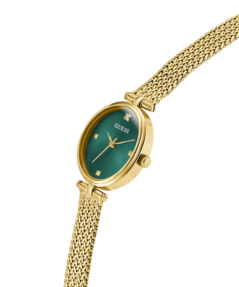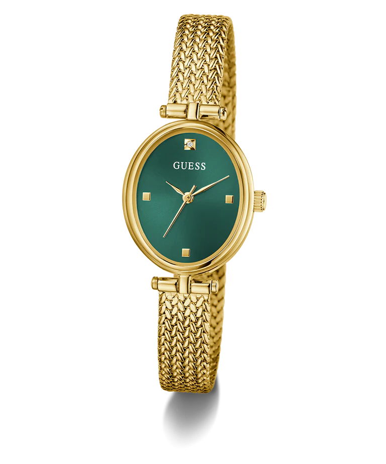 This style features 29 mm x 24 mm oval case in gold tone polished stainless steel paired with a herringbone textured self-adjustable mesh bracelet. The green sunray dial showcases a lab grown diamond at the 12 o'clock hour. Powered by precise quartz analog movement and water resistant up to 30 meters, this pretty new design is perfect for the woman who appreciates authentic luxury details and timeless sophistication.