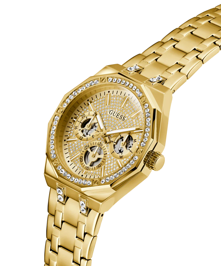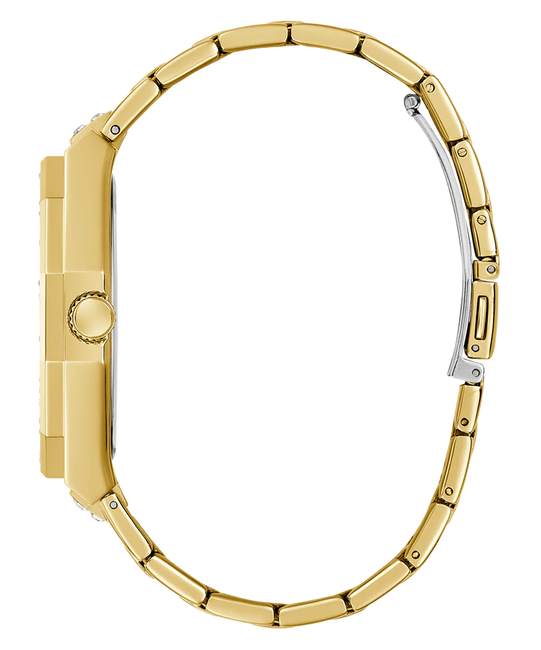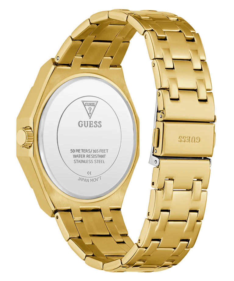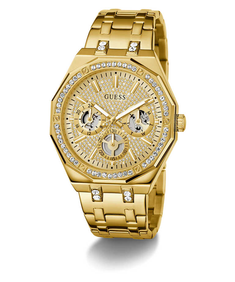 Bring your bling game to the next level with this stunning gold tone multi-function watch! This 43 mm round polished gold tone stainless steel timepiece is embellished with crystals on both the case and bracelet, paired with a glitz multi-function dial featuring cut-out detailing in the subdials. offering 50 meters water resistance, this show-stopping timepiece is perfect for the GUESS Guy who is the ultimate bling enthusiast.