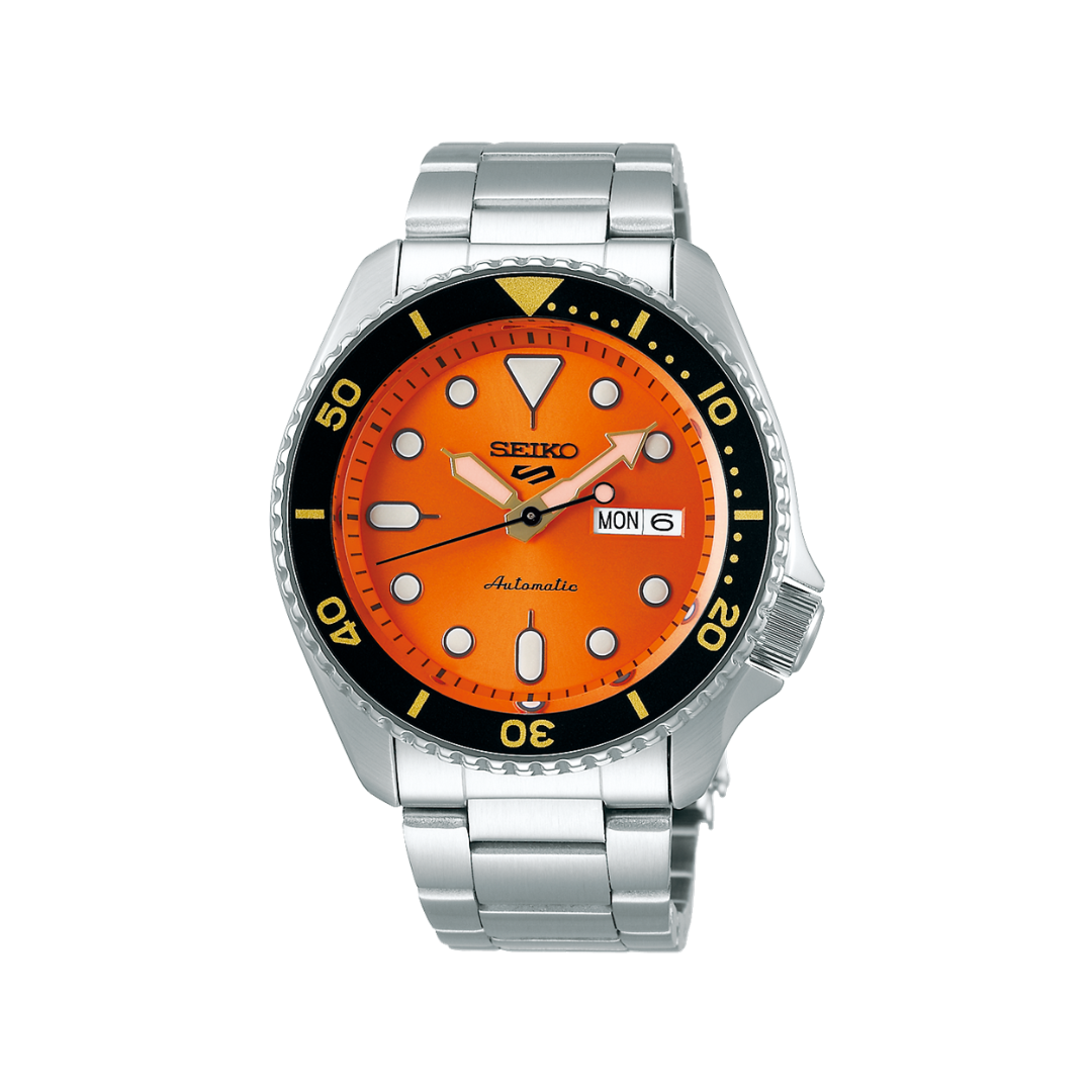 Cette montre Seiko 5 Sports Series Seiko avec mouvement automatique a un boîtier en acier inoxydable et un cadran orange avec des détails jaunes. Son bracelet est en acier inoxydable. Taille du boîtier 42,5 mm. La montre Seiko est submersible jusqu'à 10 BAR.