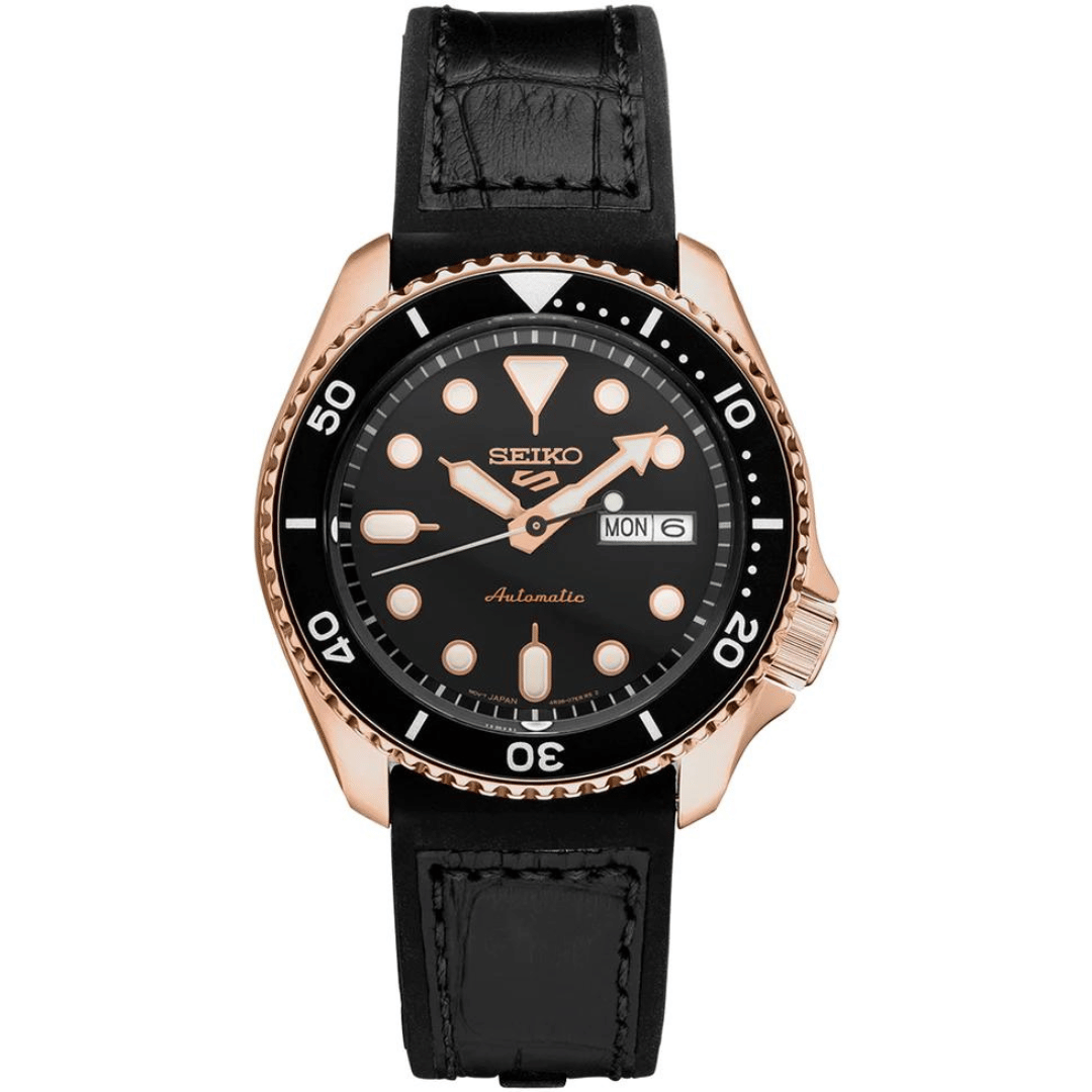 Boîtier en acier inoxydable couleur or rose avec bracelet en silicone noir. Lunette tournante unidirectionnelle en acier inoxydable noir. Cadran noir avec aiguilles en forme de flèche et index en forme de flèche couleur or rose. Marqueurs de minutes autour du bord extérieur. Type de cadran : analogique. Aiguilles et index luminescents. Affichage du jour et de la date à 3 heures. Mouvement automatique Seiko Calibre 4R36, contenant 24 rubis, mordant à 21 600 alternances par heure et disposant d'une réserve de marche d'environ 41 heures. Cristal Hardlex résistant aux rayures. Tirer/pousser la couronne. Fond du boîtier transparent. Forme du boîtier rond. Taille du boîtier : 42,5 mm. Largeur de bande : 22 mm. Fermoir à boucle. Résistant à l'eau à 100 mètres / 330 pieds. Fonctions : date, jour, heure, minute, seconde, stop trotteuse. Style montre de sport. Étiquette de la montre : Japan Movt. Seiko Seiko 5 Sports Montre automatique pour homme à cadran noir SRPD76K1.