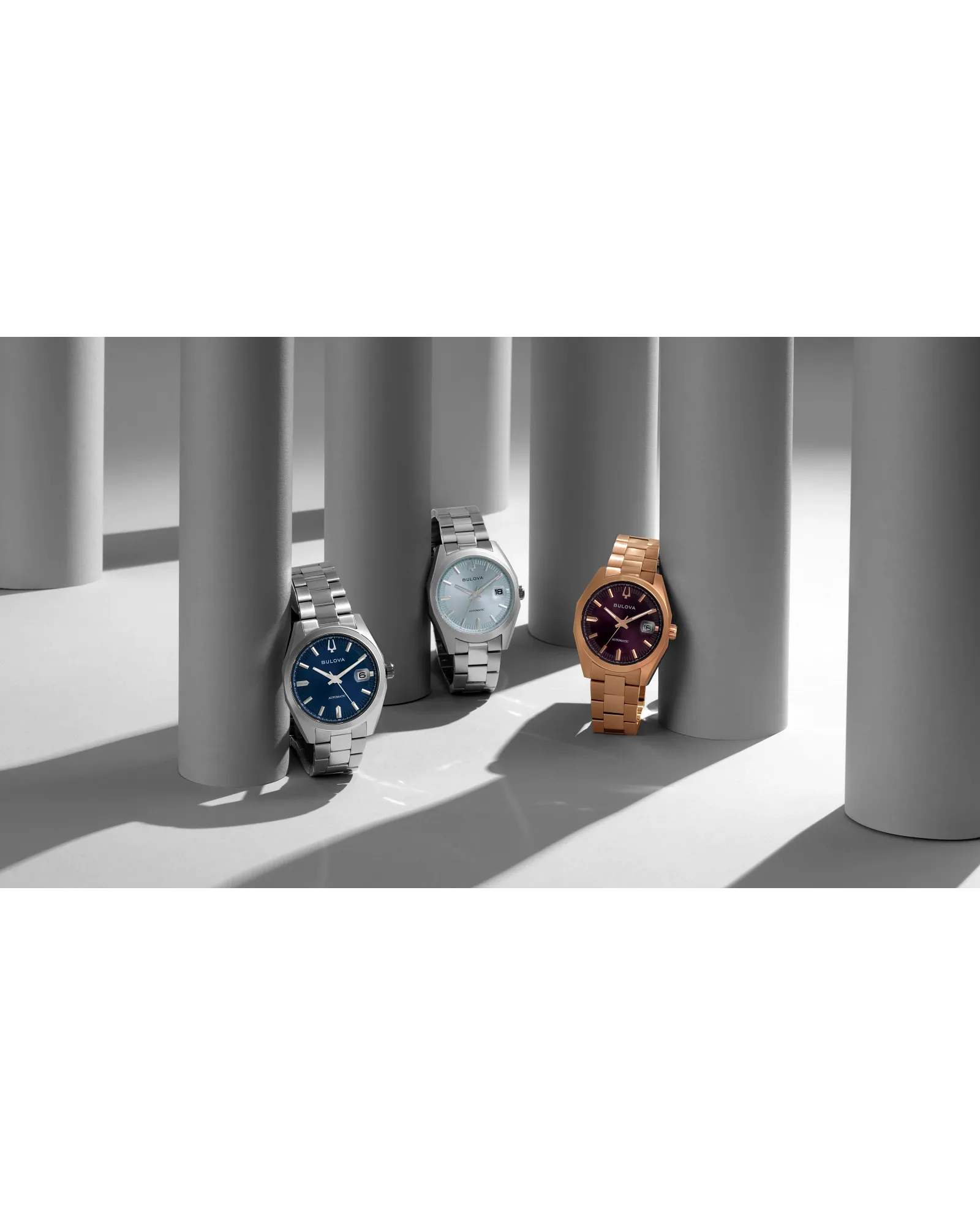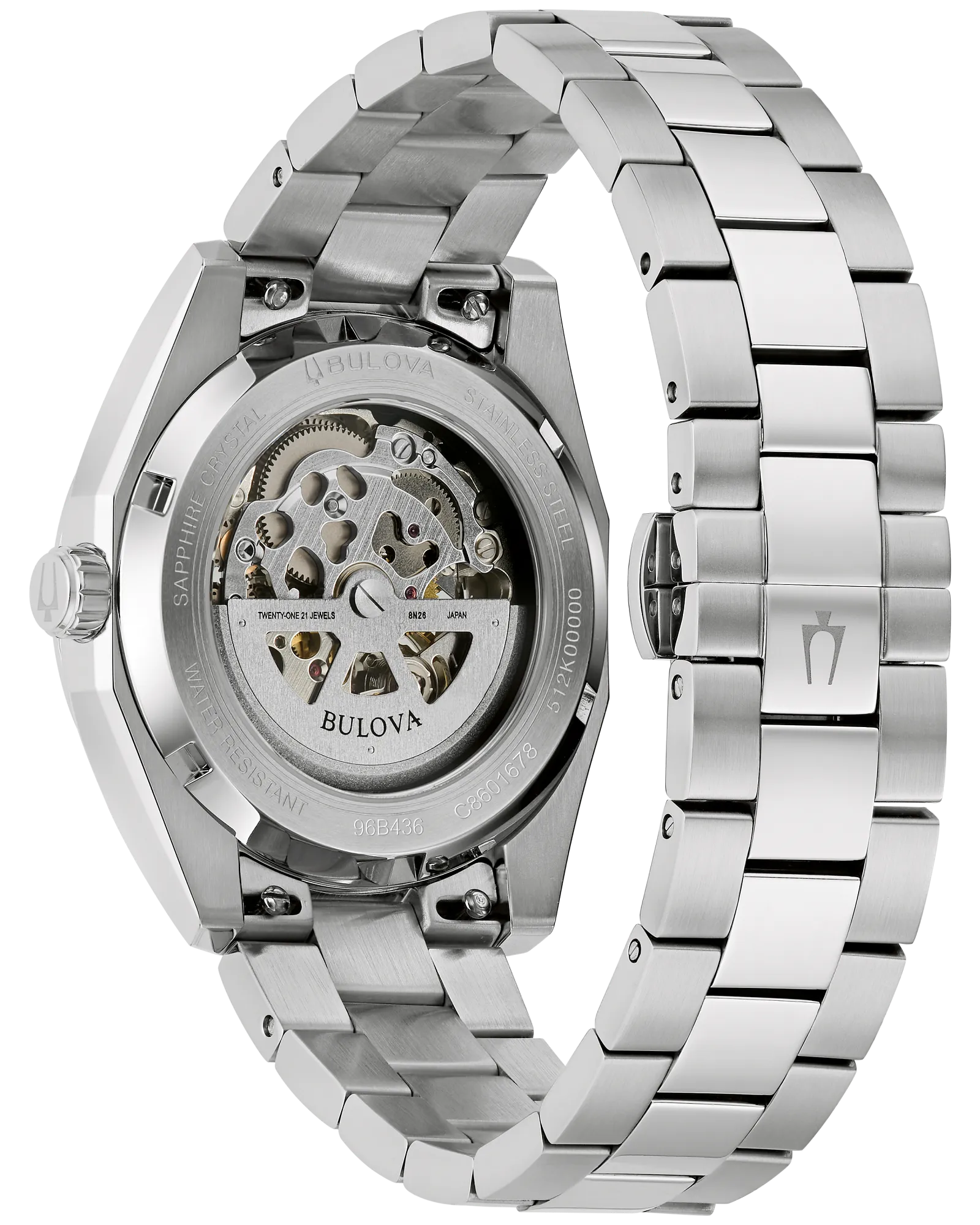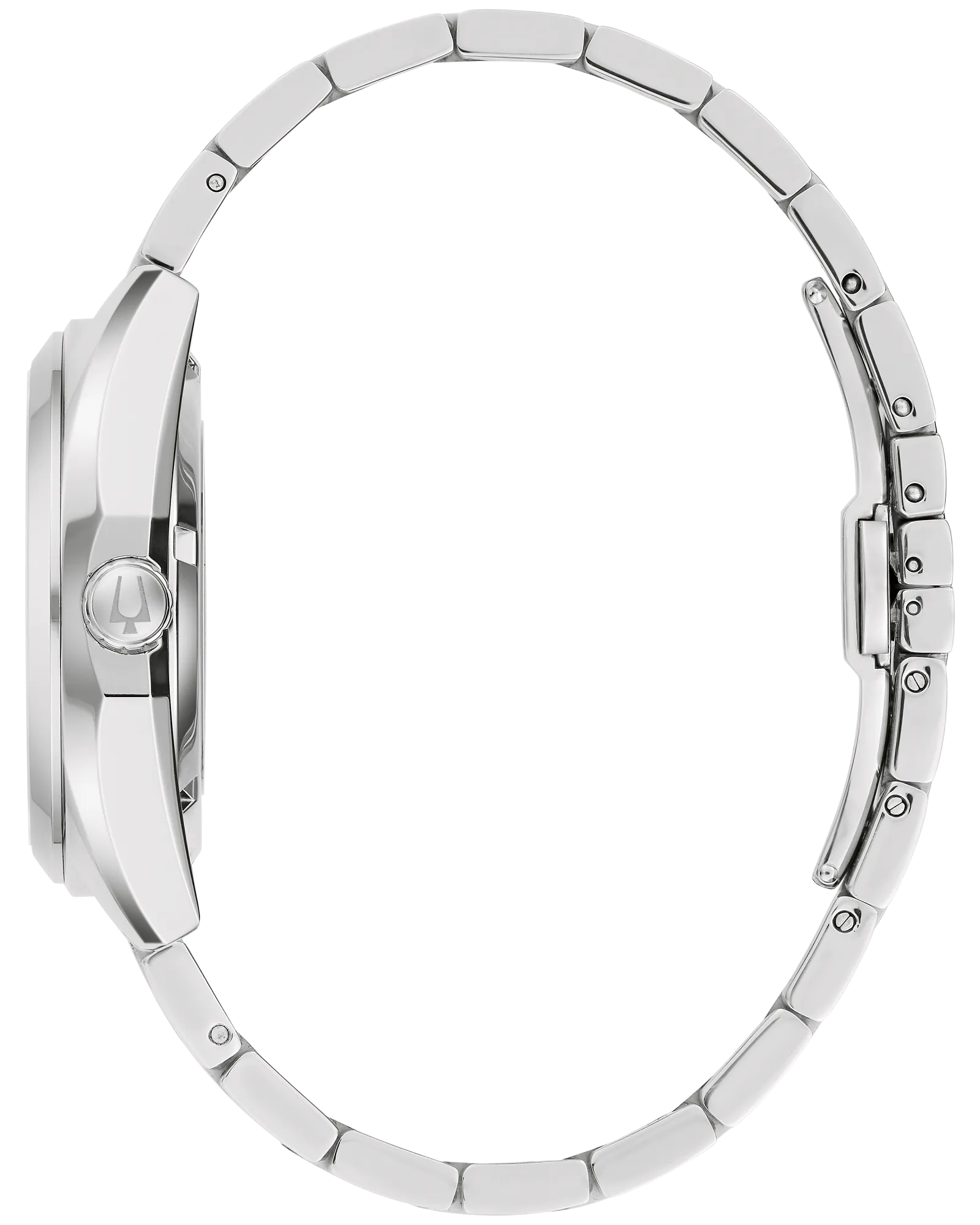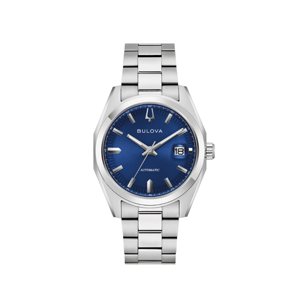 The Bulova men’s Surveyor is defined by exceptional quality and sophisticated aesthetics. The silver-tone stainless steel case features sculpted edges and faceting which provide an effortless wear on the wrist, with polished and brushed finishing, a flat sapphire crystal, and a matching quick-release 3-link stainless steel bracelet with a push-button deployant clasp. The vibrant blue dial has a sunburst finish and features silver-tone accents, hands with luminescent fill, debossed minute markers, and a magnified date display. The watch is powered by an automatic movement with 21-jewels and a 42-hour power reserve, which can be seen in full through a mineral crystal exhibition window in the caseback. For those with a discerning eye for refined luxury, this Bulova men’s timepiece is the obvious choice.
