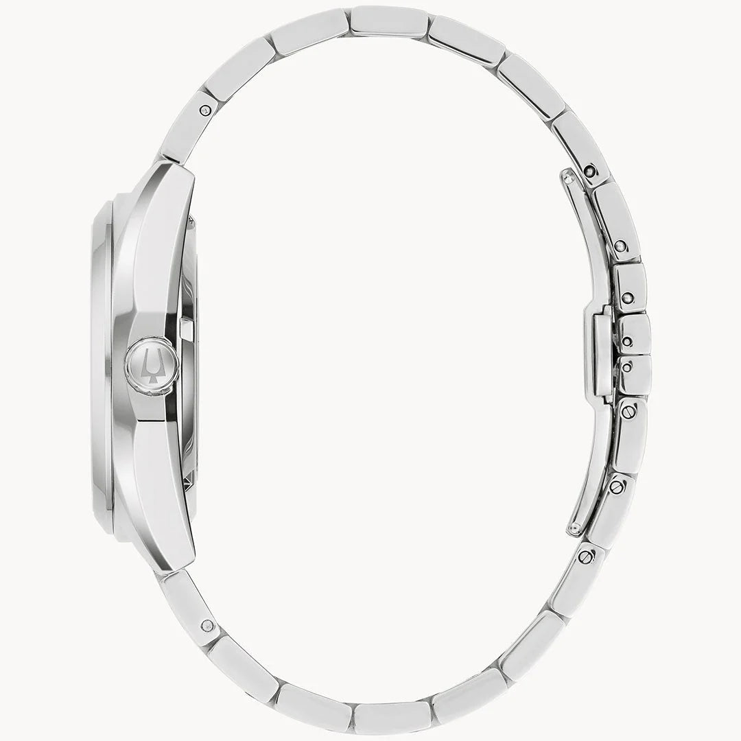 Defined by exceptional quality and sophisticated aesthetics, the Bulova men’s Surveyor is the quintessential modern timepiece. Sculpted edges and faceting distinguish the silver-tone stainless steel case, with polished and brushed finishing, a flat sapphire crystal, and a 3-link stainless steel bracelet with a push-button deployant clasp with easy-release latched spring bars. The radiant light blue dial has a sunburst finish and silver-tone accents, luminous hands, applied minute markers, and a magnified date display. The watch is powered by an automatic movement with 21-jewels and a 42-hour power reserve, which can be seen in full through a mineral crystal exhibition window in the case back For those with a discerning eye for refined luxury, this Bulova men’s timepiece is the obvious choice.