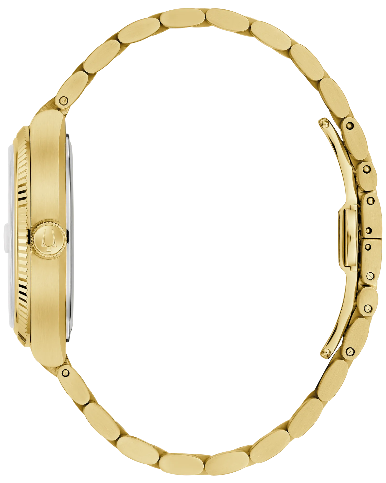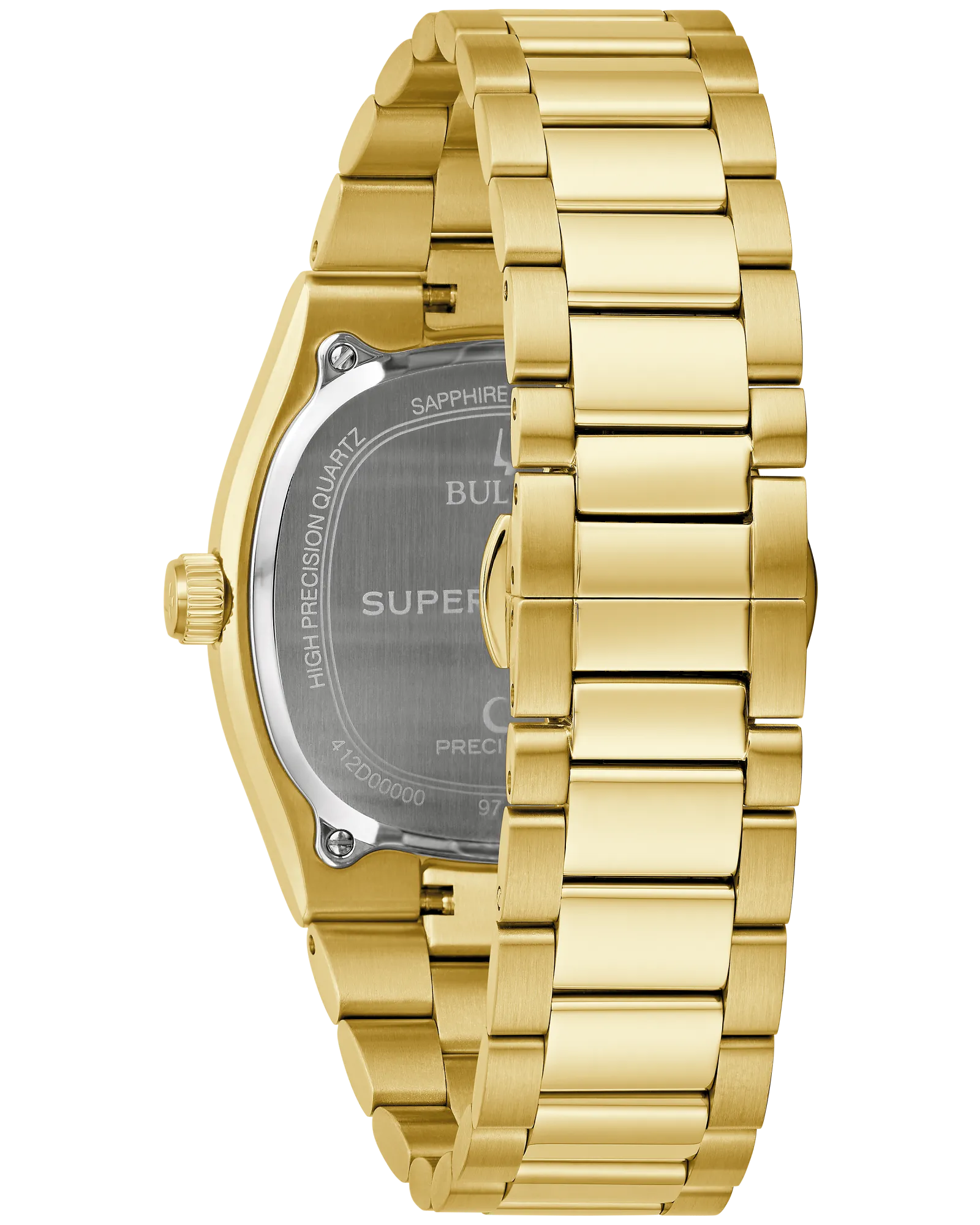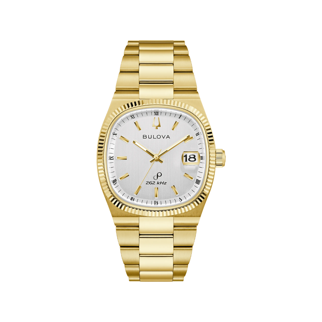 Drawing inspiration from the incredible Bulova Super Seville Day-Date from the 1970s, the new Super Seville merges retro aesthetics with state-of-the-art Precisionist technology for a timeless modern appeal. The gold-tone stainless steel 38mm case has the versatility to be worn by most anyone and makes a bold statement with a seamless silhouette created by the retro TV-shaped case transitioning into the integrated 3-link stainless steel bracelet, which features a secure and convenient push-button deployant clasp. An elegant, grooved coin edge bezel enhances the case and surrounds the flat sapphire crystal and its date magnifier. The sophisticated vertical brushed dial is silver-white with polished hands and indices and a date situated perfectly at 3 o’clock. The new Super Seville is powered by our proprietary high precision quartz Precisionist movement, a revolutionary 8-jewel quartz mechanism vibrating at a remarkable 262kHz, accurate to seconds per year with increased resistance to temperature changes, and with a smooth sweeping second hand. Embrace an effortless kind of elegance with the men’s Bulova Super Seville.
