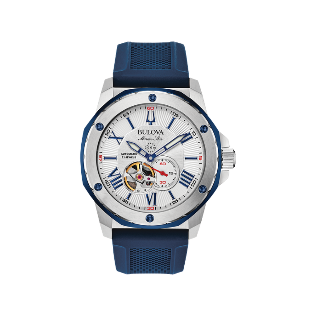 Introducing the new Marine Star featuring a three-hand automatic movement showcased in an open aperture. Silver-tone stainless steel case with blue-tone outer ring. Silver white dial with flat mineral crystal. Blue textured silicone strap with a contrasting red underside. Water resistance to 200 metres.