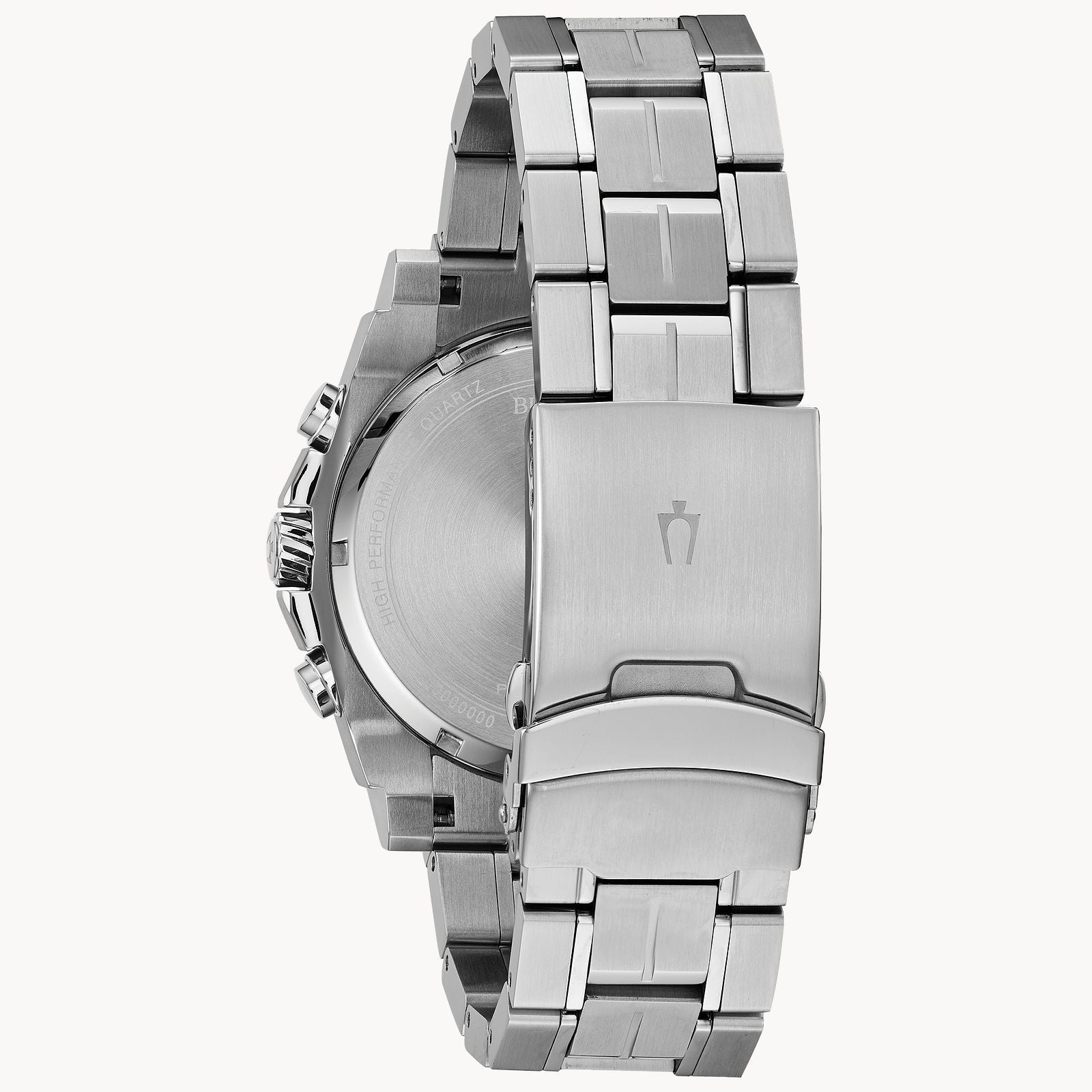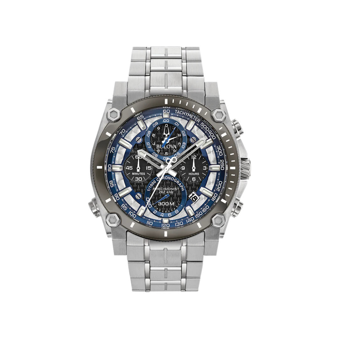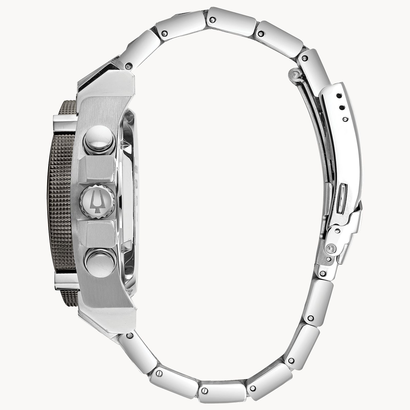 Powered by Bulova’s proprietary Precisionist eight-hand quartz chronograph movement with a 262kHz vibrational frequency—eight times greater than standard timepieces—for unparalleled accuracy. Stainless steel and gray IP screw-back case with screw-down crown, black carbon fiber chronograph dial with date feature, curved mineral crystal, stainless steel bracelet with fold-over buckle closure, safety bar and extender, and 300-meter water resistance.