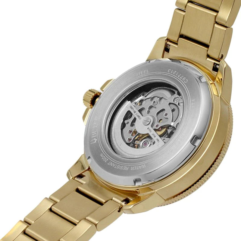 The newest addition to the Marine Star Automatic men’s classic watch collection features a sporty elegance with a nautical appeal that is all in the details. The brushed gold-tone stainless steel case is accented by the black 3-hand dial with a rotating bezel and an exhibition window that showcases the automatic 21 jewel movement to ensure optimal performance. The gold-tone stainless steel bracelet has a sport fold-over buckle with pushers for easy access and a seamless look. This watch is water resistant up to 200 metres and is the perfect look for stylish adventures on land and sea.