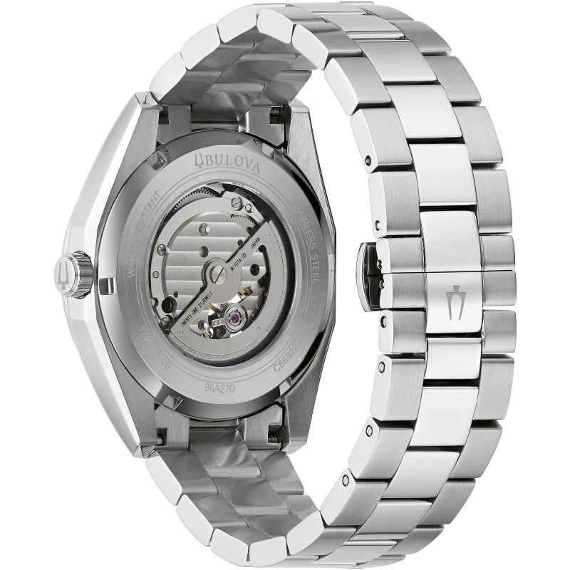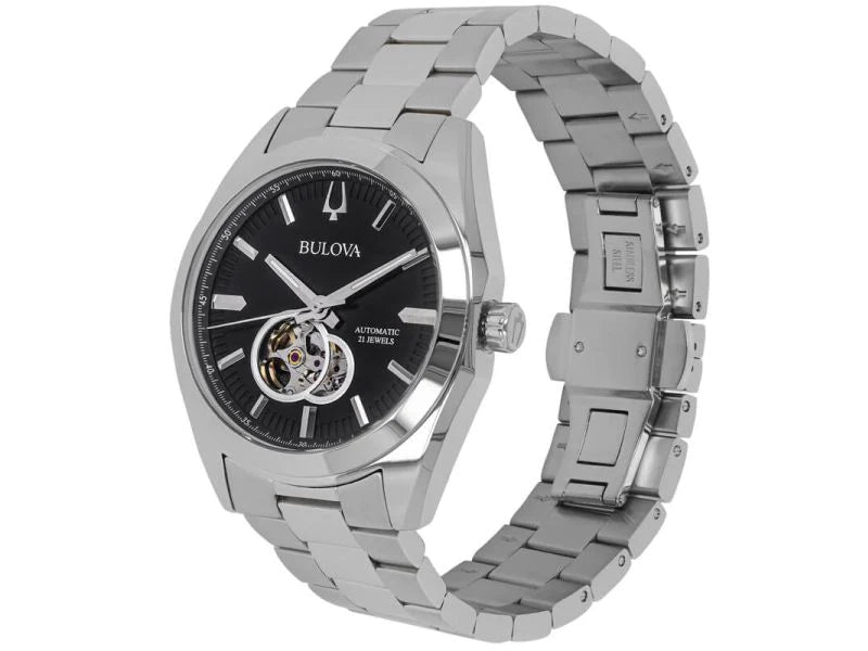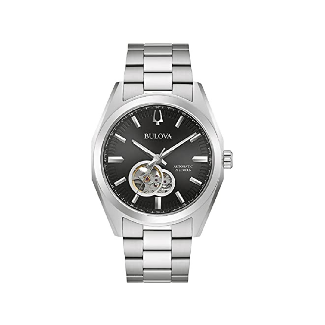 Part of the Surveyor line of Bulova watches, this updated classic automatic watch offers all of the detail and fine quality you would expect in a luxury watch, at an accessible price. The silver-tone stainless steel case and bracelet is paired with a rich black dial with silver-tone accents and an open aperture to view the movement’s balance wheel and escapement. The screw-back case is topped with a mineral crystal exhibition window to showcase the automatic movement powering the timepiece. This beautifully detailed, quality timepiece is destined to become a new favorite in any collection.