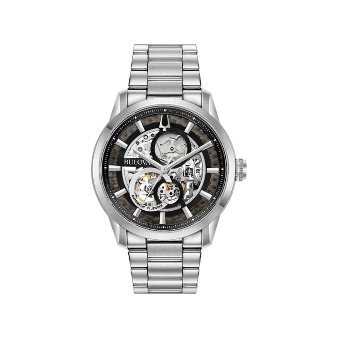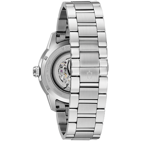 Sophisticated design with full exhibition dial and case-back. Stainless steel screw-back case, skeletonized black three-hand dial revealing the intricate workings of the self-winding 21-jewel movement, domed mineral crystal, stainless steel bracelet with push-button deployant clasp, and water resistance to 30 metres.