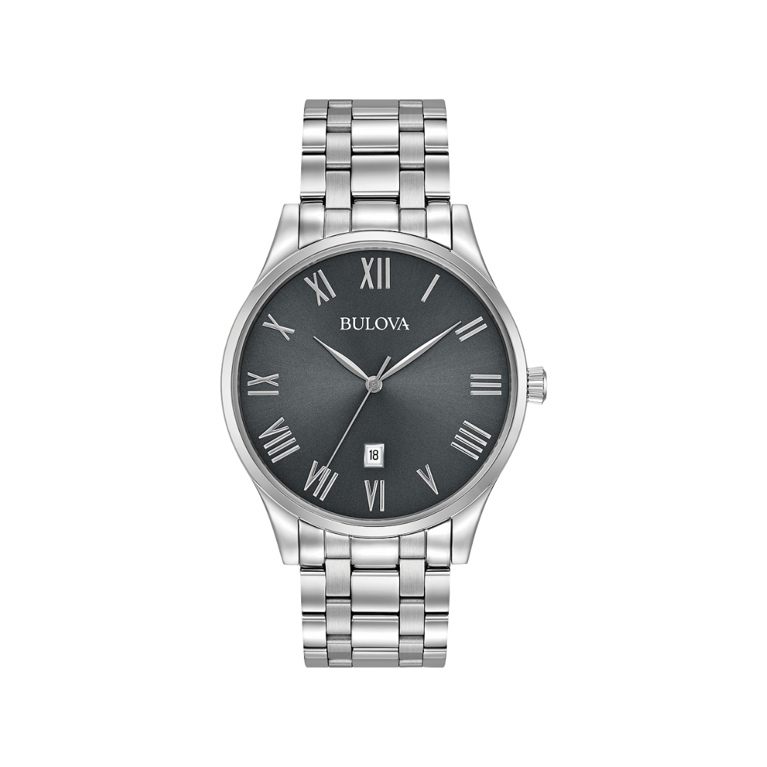 From the Classic Collection. Stainless steel case and bracelet with double-press deployant closure, gunmetal dial, three-hand calendar, flat mineral glass, and water resistance to 30 metres.