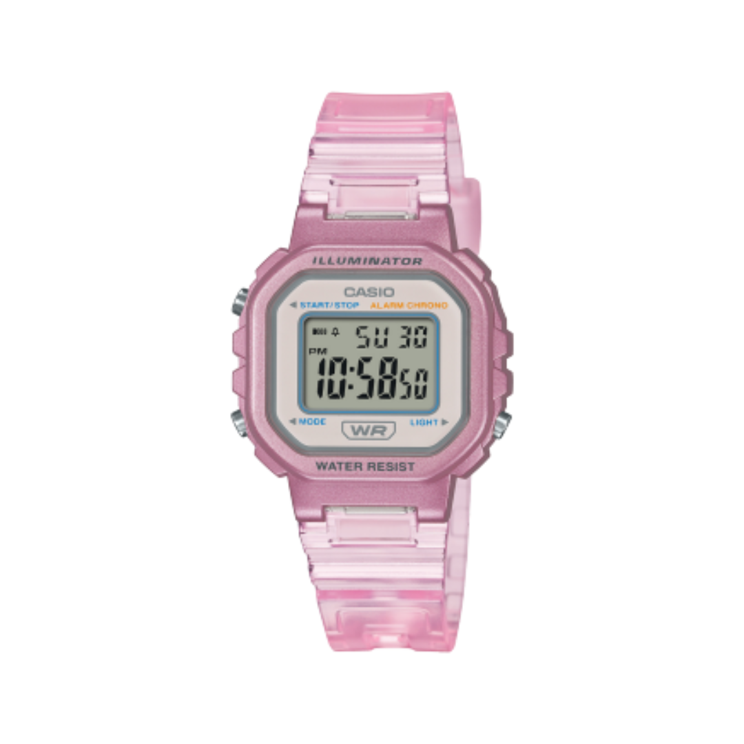Express both your bold and subtle sides with a glistening combination of metallic case and translucent band. This digital watch delivers a lightweight, comfortable fit and all the functions you need, including LED light, stopwatch, calendar and alarm. Water resistance for daily use frees you from worry even when caught in the rain.