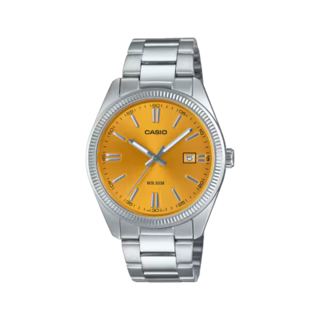 Elevate your style game with the MTP1302D-9AV. This timeless simple silver watch features a yellow dial that is complemented by luminous hands and markers, providing easy readability in low-light conditions. It is designed with a sleek stainless steel case and band, making it both sophisticated and durable.