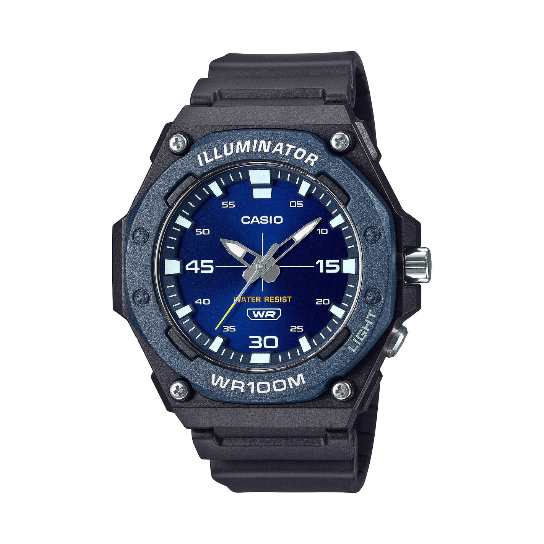 The wide case, measuring 46.1 mm, features high-visibility bar index marks to ensure an easy read. The sunray dial is a striking complement to the bezel’s metallic finish, coming together in a design that is bold and tough.