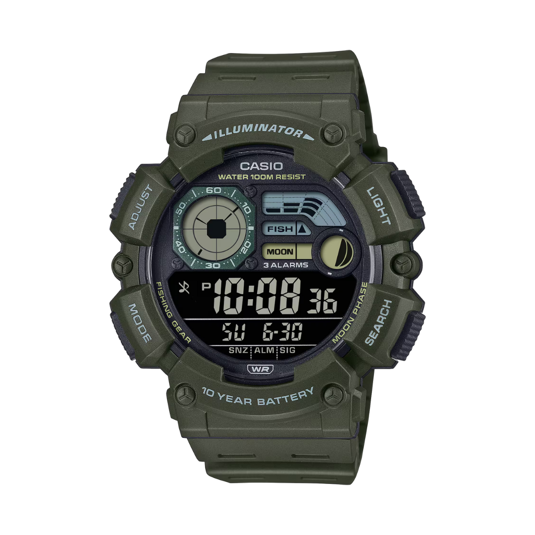 Satisfy both the stylish and the practical you with a bold take on a multifunctional digital watch in a generously sized, easy-read design. Complete with 10-year battery, water resistance up to 100 meters, LED light, and dual time display, these watches are always at the ready. The moon phase and fishing level indicator s deliver just what you need when you're out on the water.
