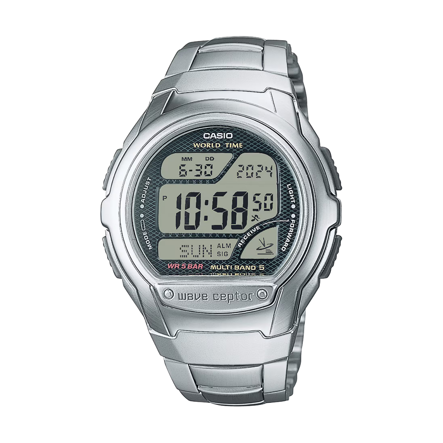 Silver Digital Wave Ceptor Watch with Metal Band featuring Countdown Timer, World Time, 1/100 Second Stopwatch and LED backlight.