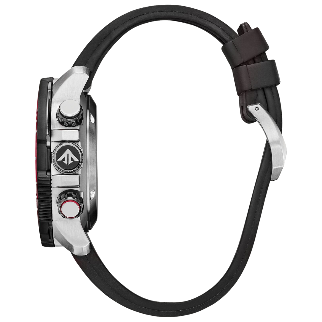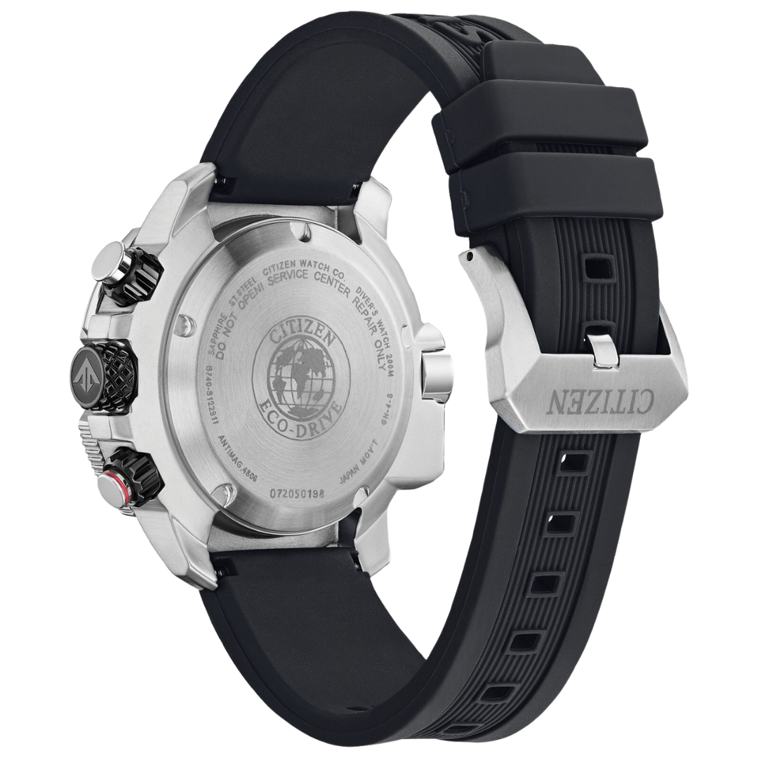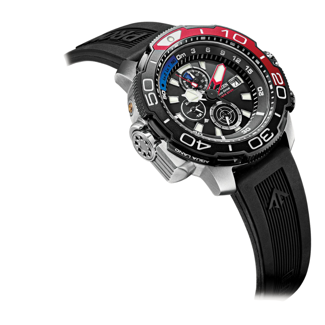 The powerful PROMASTER Aqualand from CITIZEN® has a black polyurethane strap, a stainless steel case coated with diamond-like carbon (DLC) accents, and a red accented black dial. This ISO compliant diver is packed with advanced features. It has water resistance up to 200M, making it perfect for everyday splashing around, or serious scuba diving. It also features a chronograph, 12/24-hour time, maximum depth memory, a power reserve indicator and screw-down crown and pushers. It also uses Eco-Drive technology, meaning it is powered by any light.