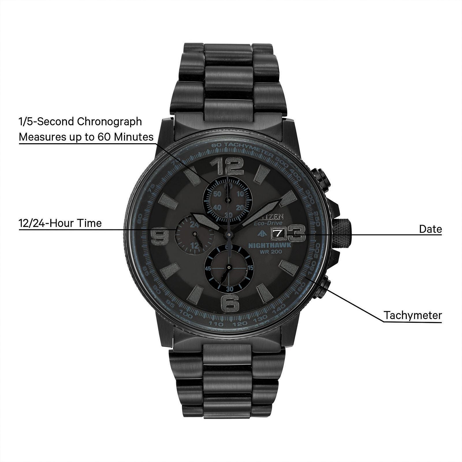 Soar to new heights with the flight-inspired Nighthawk, which exemplifies the current "blackout" aesthetic. This black ion plated stainless steel timepiece features a 1/5-second chronograph that measures up to 60 minutes, 12/24-hour time, a tachymeter, a screw-back case and a safety fold over clasp with push button. Water resistant up to 200 metres.