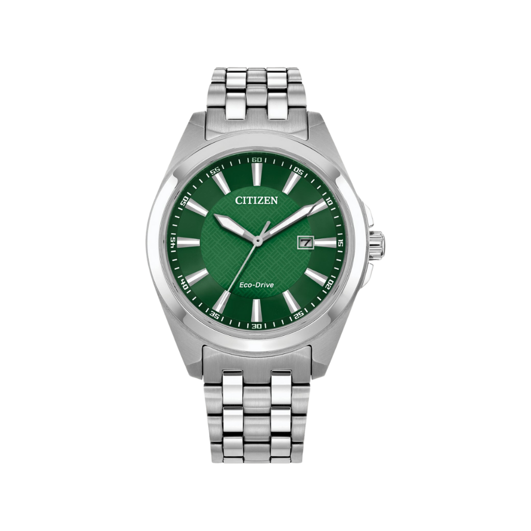 Make a distinctive style statement. Featuring a silver-tone stainless steel case and a green 3-hand dial encased in sapphire crystal, this men’s timepiece is a combination of functional simplicity with a touch of elegance. The silver-tone stainless-steel bracelet has a fold over clasp with push buttons, giving the watch an understated refinement. Water resistant to 100 metres and sustainably powered by any light with Eco-Drive that never needs a battery.