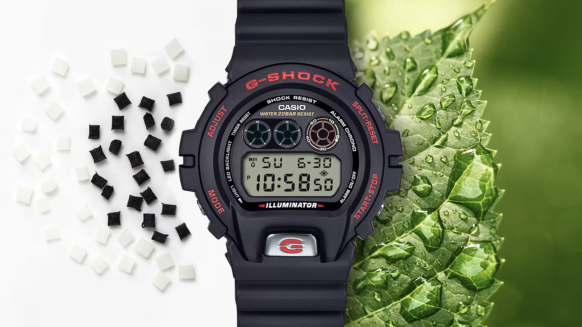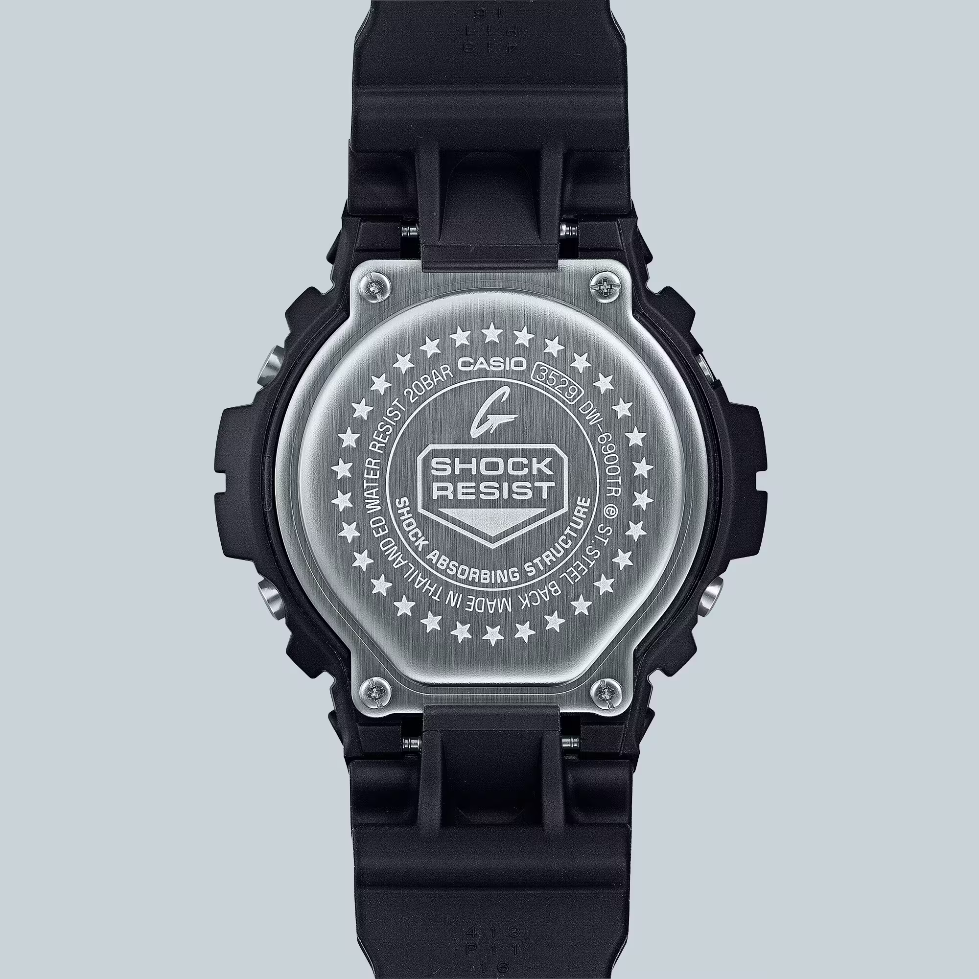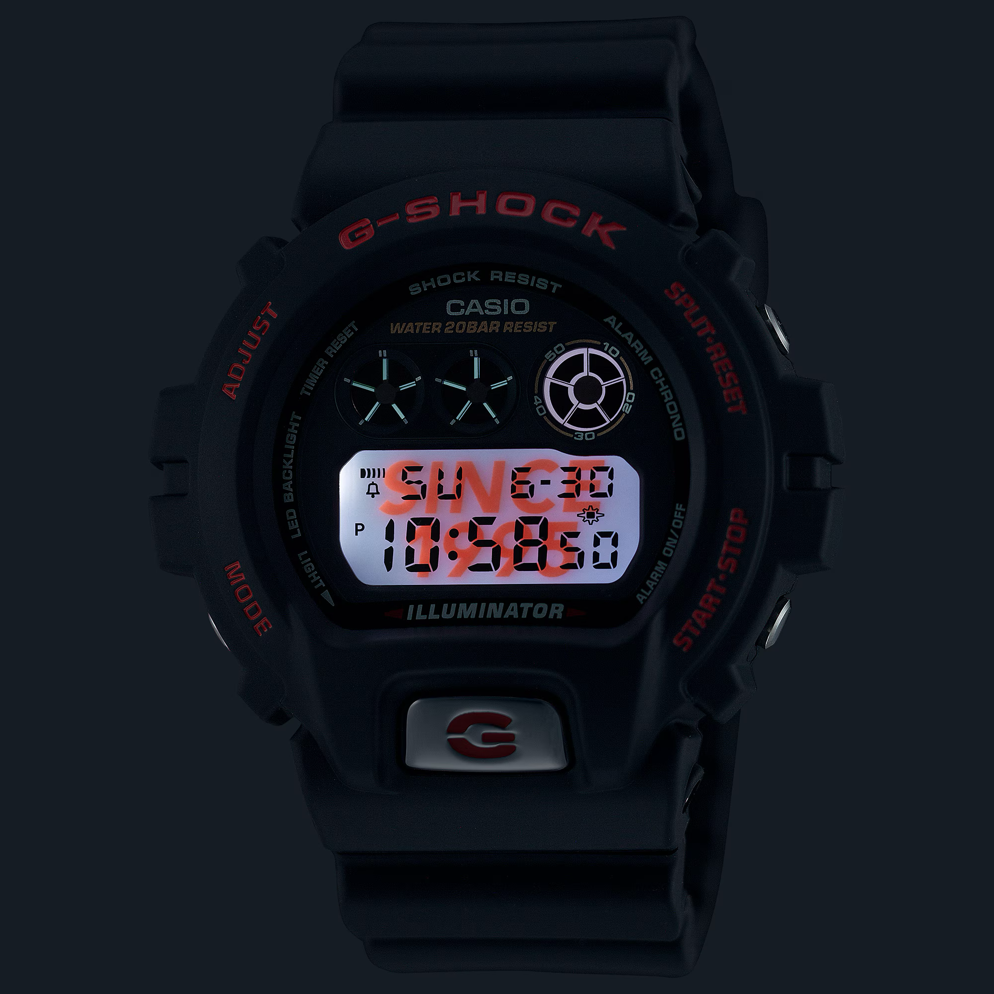 We shine the spotlight on the iconic 6900 front button, now in metal with a “G” mark etched into the mirror-finished surface for a powerful sense of presence, right at the heart of the classic round form. Press the light button to activate the backlight and the words “SINCE 1995” appear on the LCD. The “SHOCK RESIST” logo engraved on the case back is surrounded by 30 stars commemorating 30 years of the 6900 line.