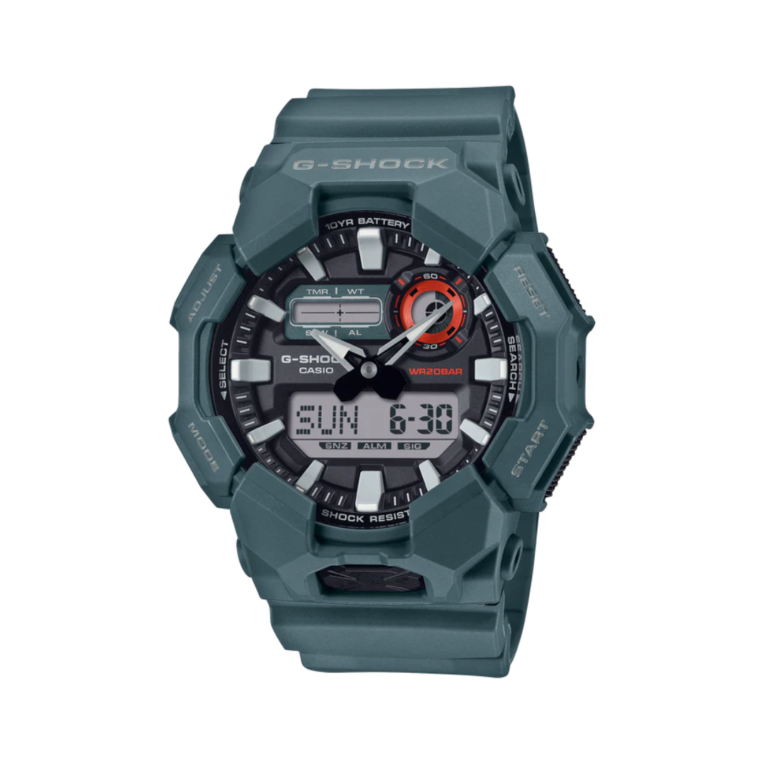 The analog-digital GA-010 delivers handy features like world time and stopwatch, as well as a high-brightness LED light, which can be easily accessed from the large button on front of the case, ensuring visibility even in the dark.