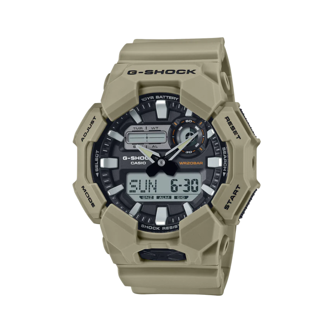 The analog-digital GA-010 delivers handy features like world time and stopwatch, as well as a high-brightness LED light, which can be easily accessed from the large button on front of the case, ensuring visibility even in the dark.