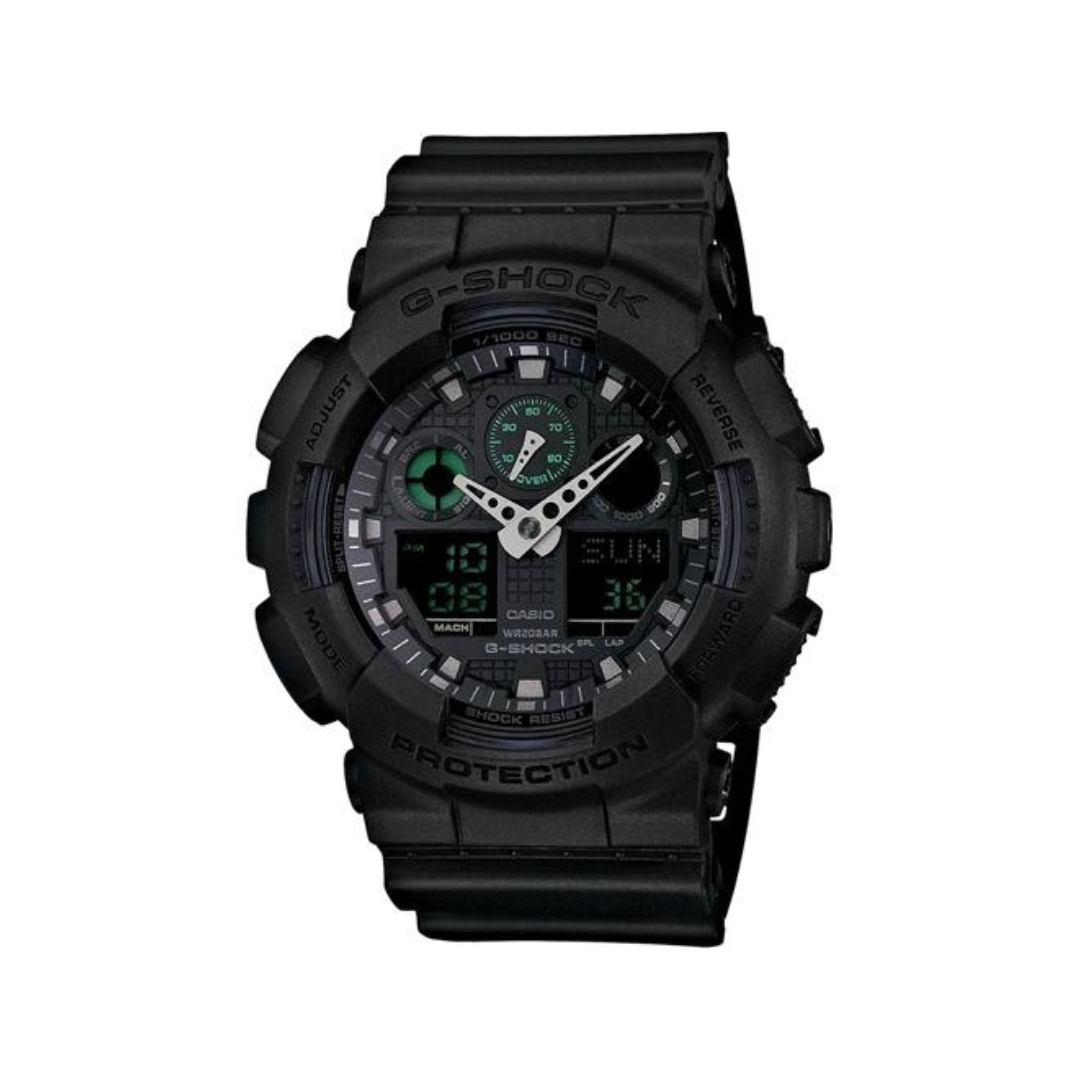 G-Shock's most popular large case analog/digital series introduces a matte black watch, the GA100MB-1A. The face and band are matte black with green accents which highlight the toughness and coolness of G-Shock.