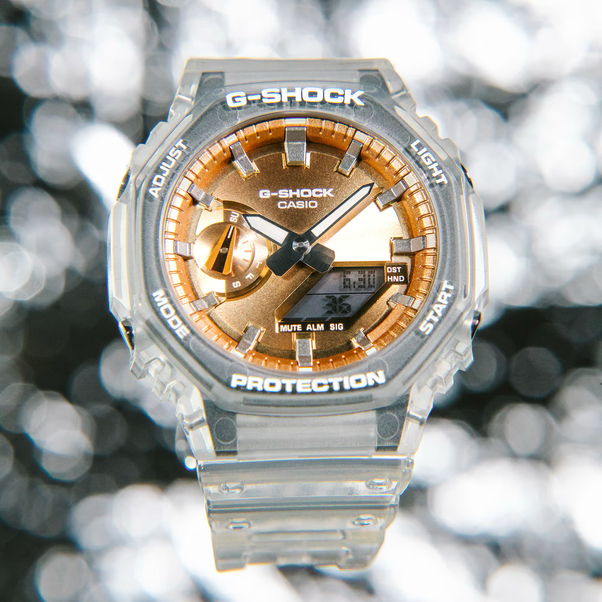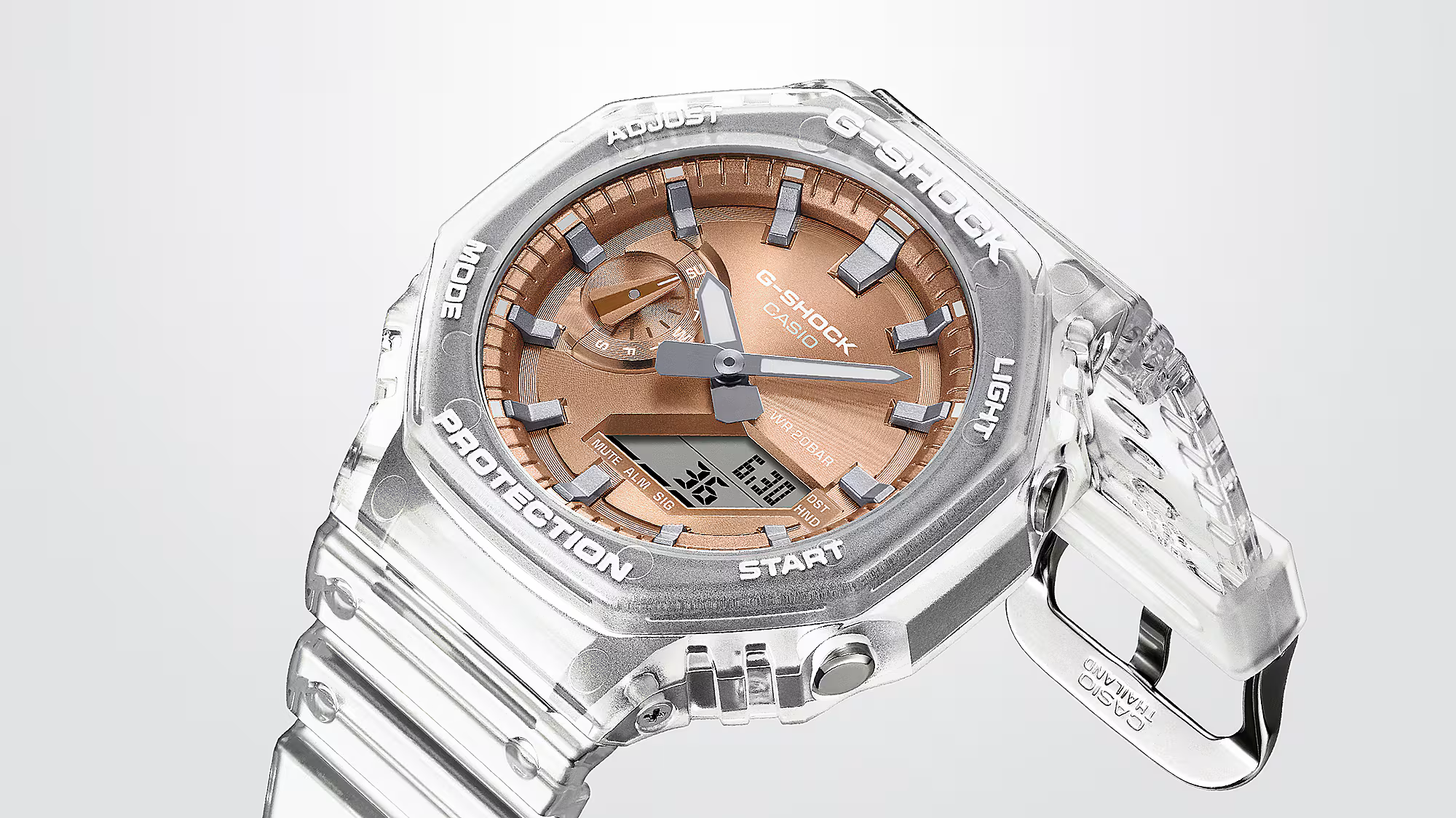 The GA2100 with octagonal bezel is paired with a dial finished in metallic vapor deposition in popular color — rose gold — offset by a translucent band for a confidently cool look.