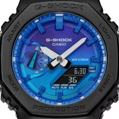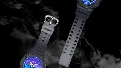 Beginning with the GA-100 with distinctive large case and the GA-2100 with octagonal case, the design brings in motifs of billowing smoke for the band and features a brightly burning dial in flames of blues or oranges.