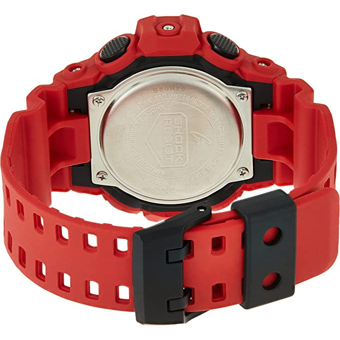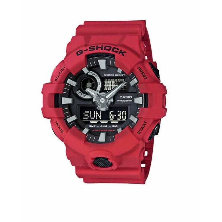 From G-SHOCK, the watch brand that constantly sets new standards for toughness, comes the GA700 analog-digital watch with bold new case silhouette featuring 3D dial and hands for a multi-dimensional, carved out of metal look. This new design not only improves reading, but projects added toughness with front button super illuminator LED light adding to its overall dynamic styling. Three colorways in black & red reflect the G-SHOCK brand concept and capture the ethos of Absolute Toughness which these models are designed to represent.