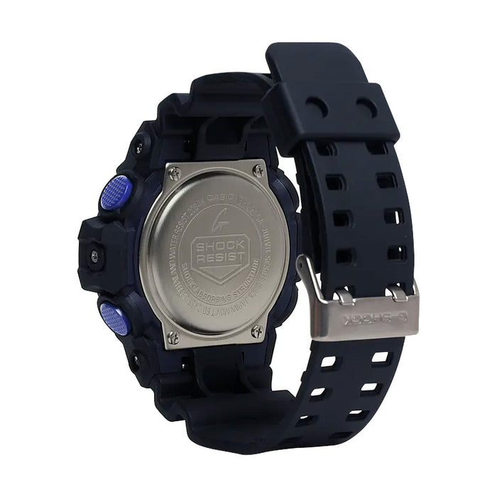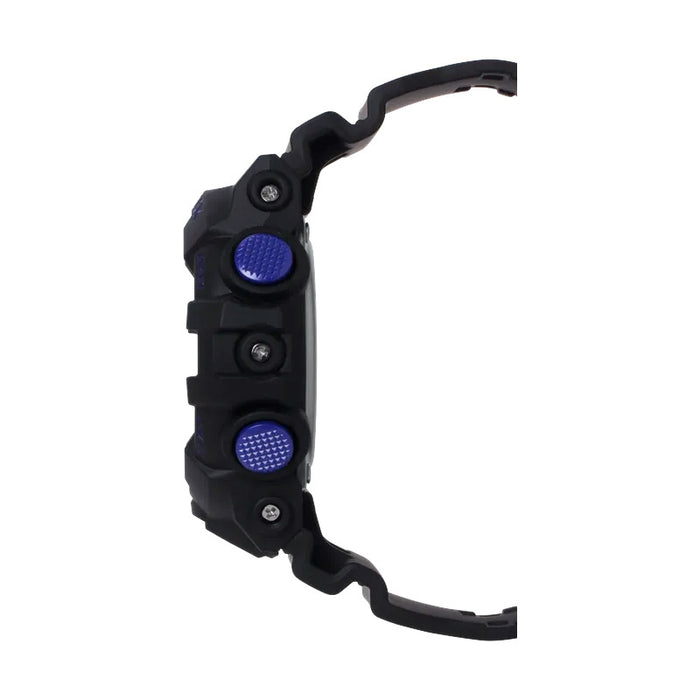 The analog-digital GA700VB-1A takes a dive into the world of virtual reality. The basic black coloring of the watch is accented by blue violet, which creates a futuristic atmosphere of virtual reality for the rugged, big case GA700.