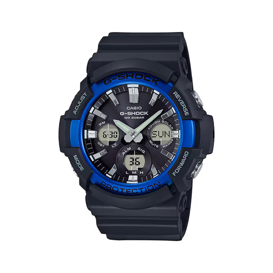 From G-SHOCK, the watch brand that is constantly setting new standards for timekeeping toughness, come new basic color models using on big case, Tough Solar GAS-100 as the base. A large, rugged case combines with an aluminum bezel and basic coloring. The bezel of the GAS-100B-1A2DR is a popular blue hue that adds a sporty accent to the overall design.